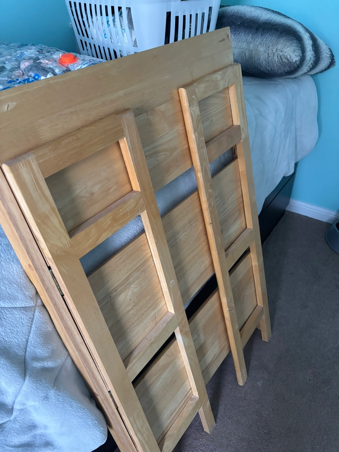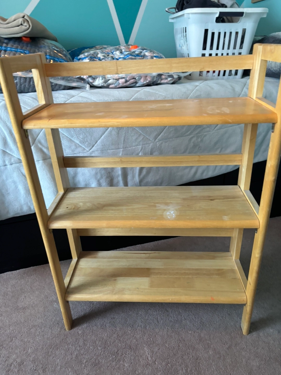 Three-shelf wooden bookcase. Light wood finish. Some minor cosmetic imperfections. Sturdy construction. Perfect for a bedroom, classroom or small space.