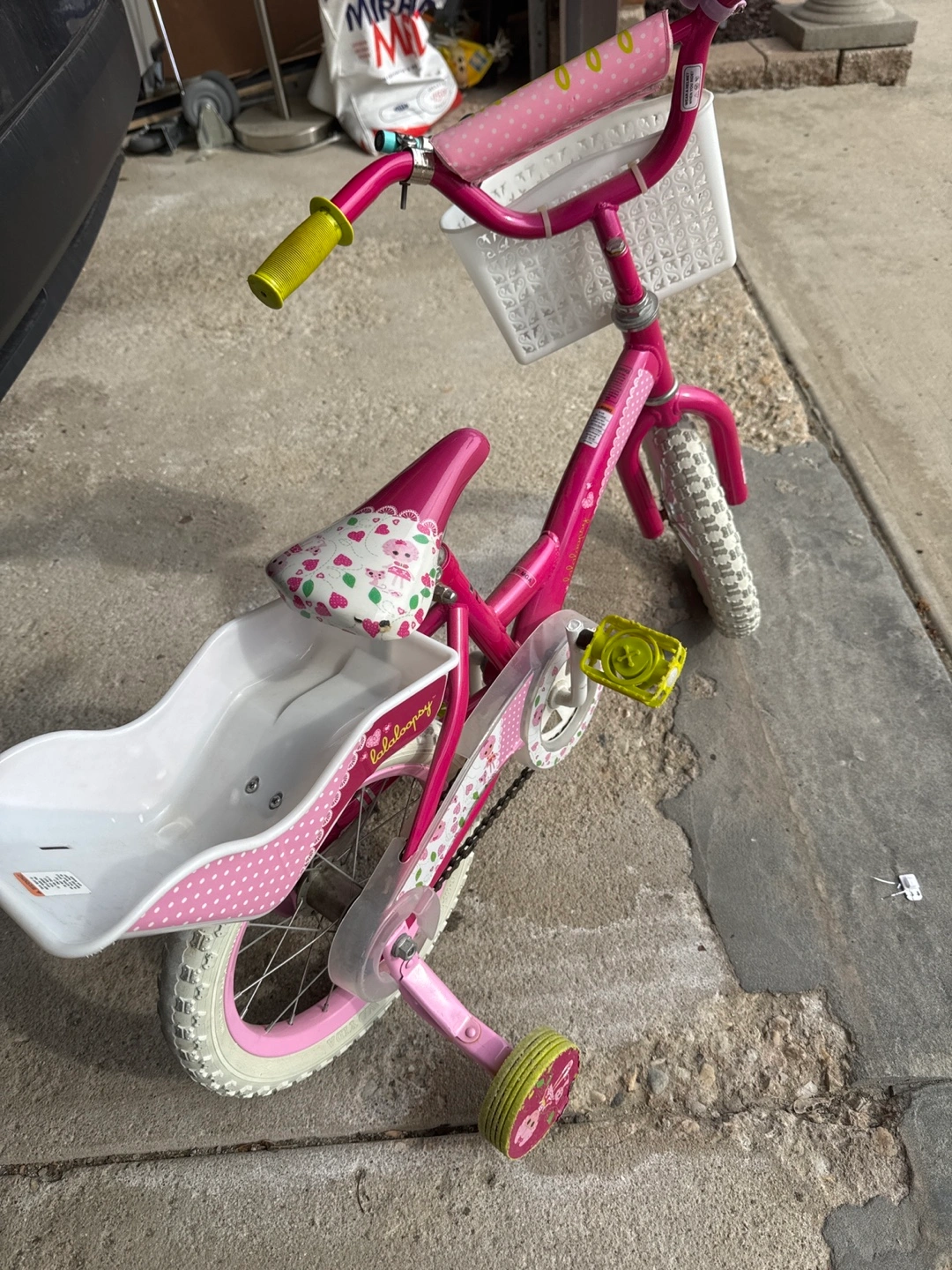 Pink girls bike. Includes training wheels and a front basket. Features a pink and white color scheme with floral accents. Suitable for younger children.