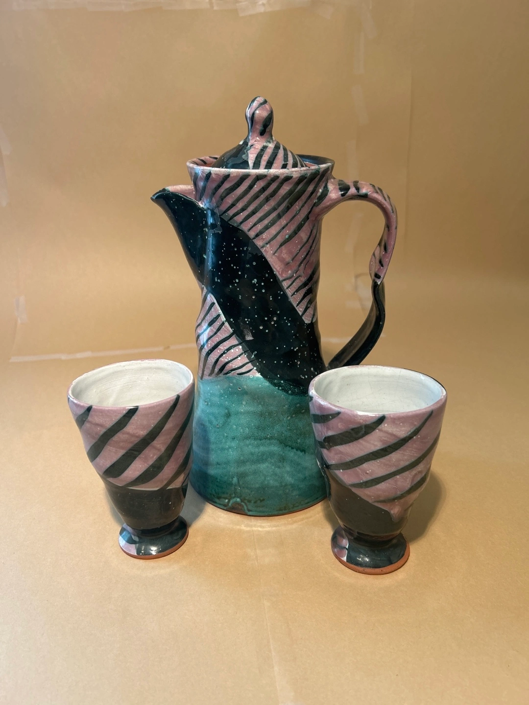Unique ceramic coffee pot and two mugs. Features hand-painted design. Teal base. Excellent for a coffee lover…Pot is 10” tall x 4 1/2” diameter, cups are 4 1/2” tall x 2 1/2” diameter