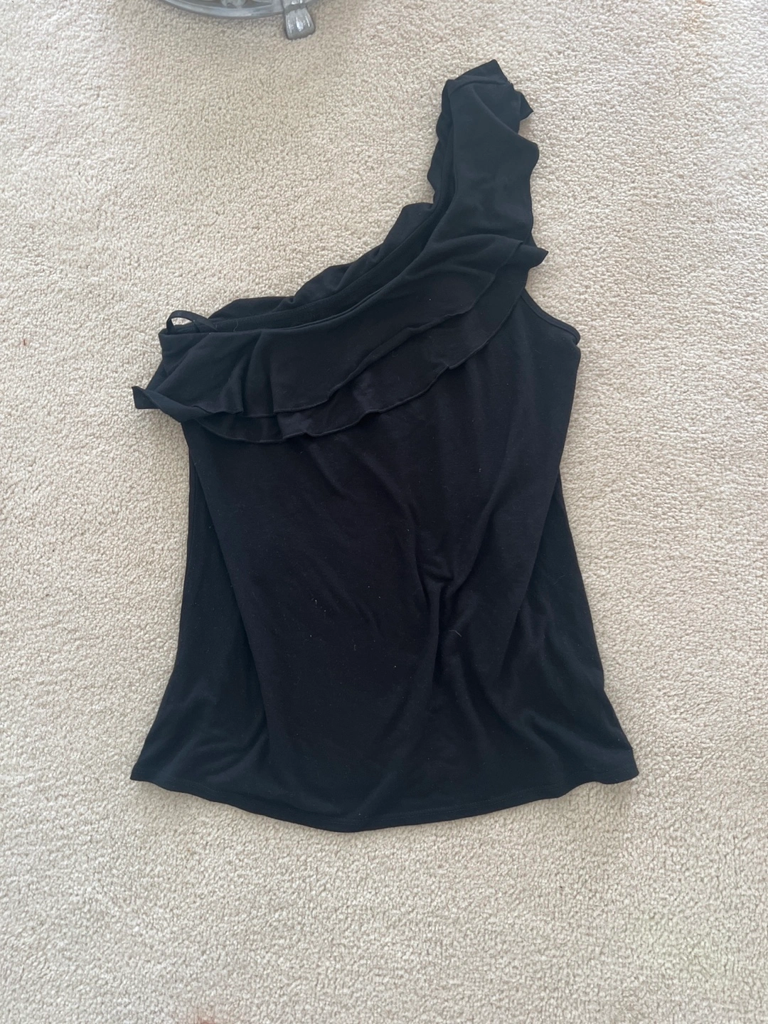 Flowy black cotton top. One-shoulder design. Features a double-layered ruffle detail. Simple and stylish.
