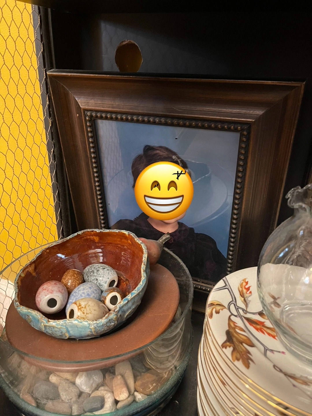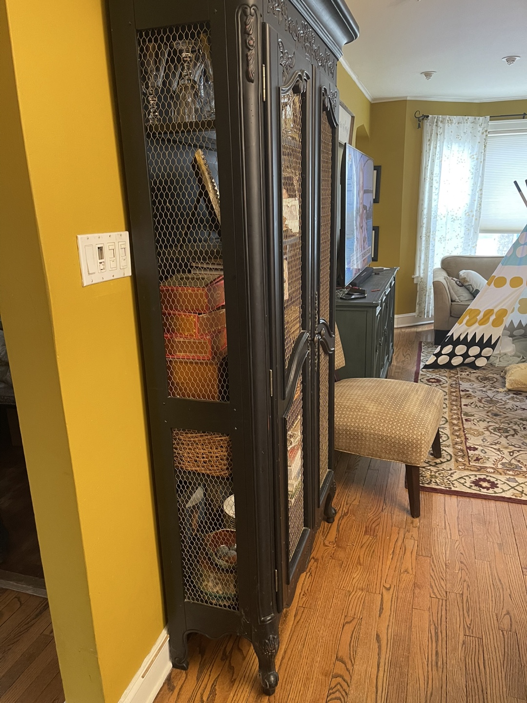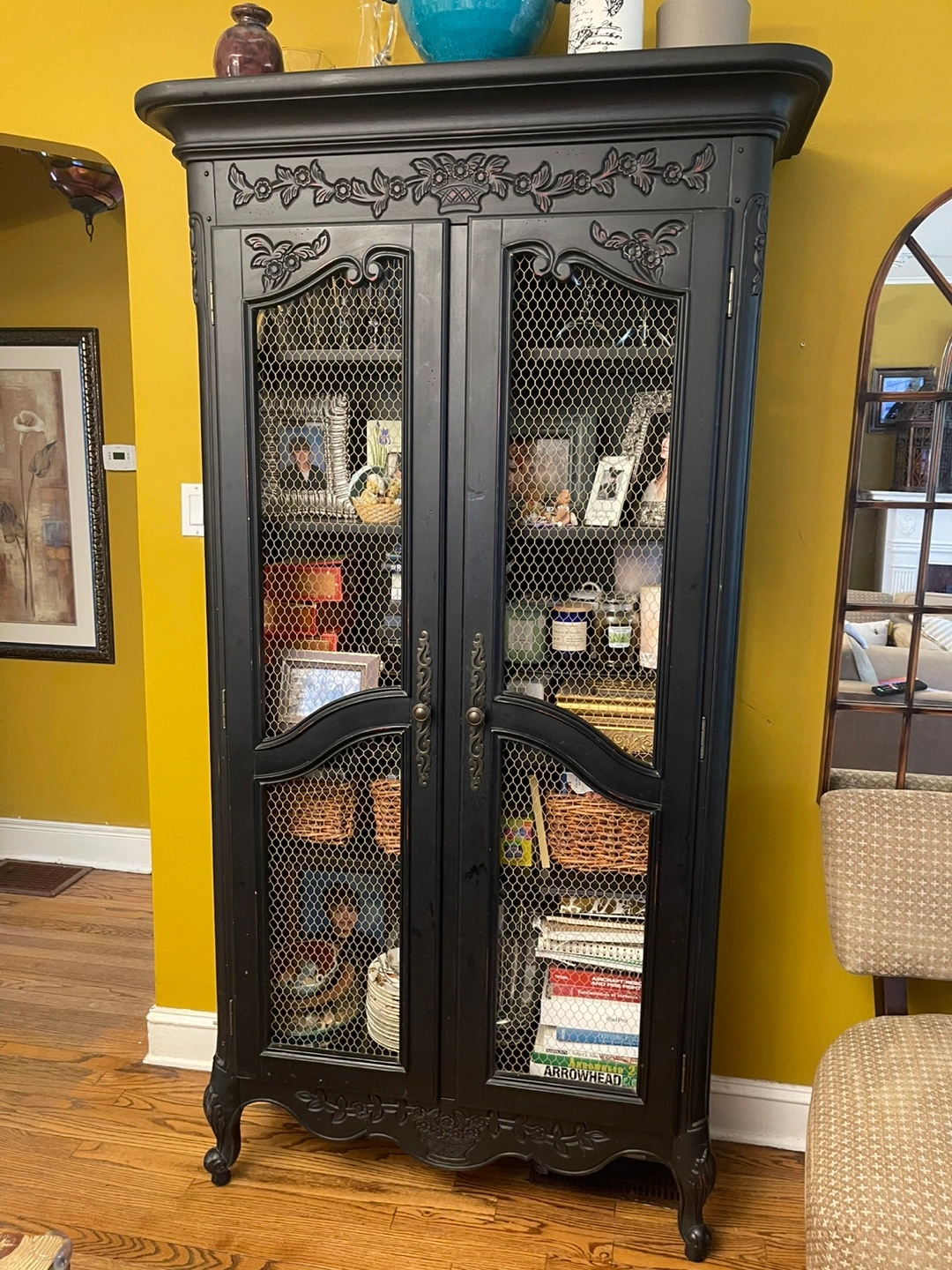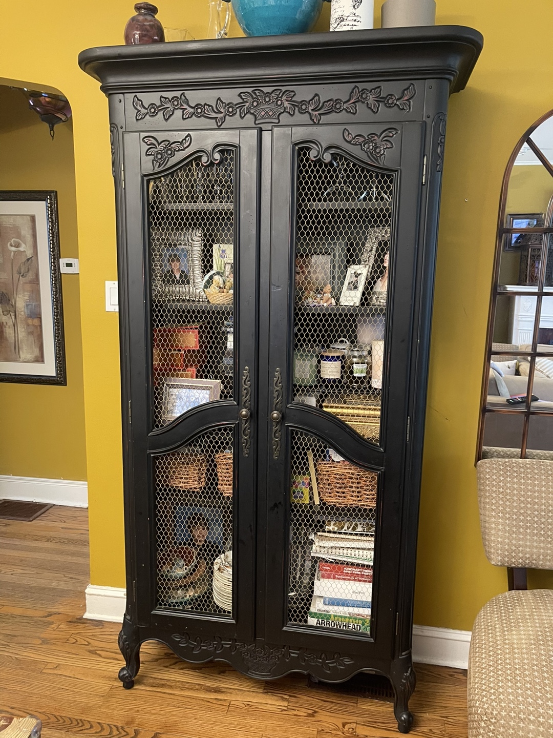 Tall black cabinet. Ornate carvings. Wire mesh doors. Shelves inside. Perfect for storage or display.
