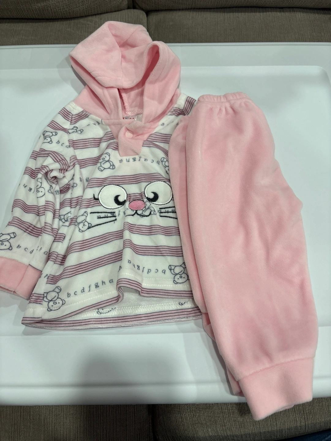 Adorable baby girl's two-piece outfit. Features a hooded long-sleeve top with cute cat and bear designs. Matching pink pants included. Soft and cozy velour material.