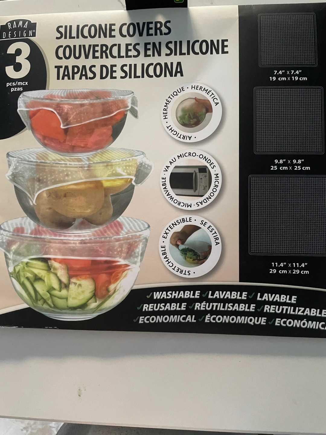 Three reusable silicone bowl covers. Various sizes included. Microwave and dishwasher safe. Airtight and economical. Porch pick up Yonge and 16th