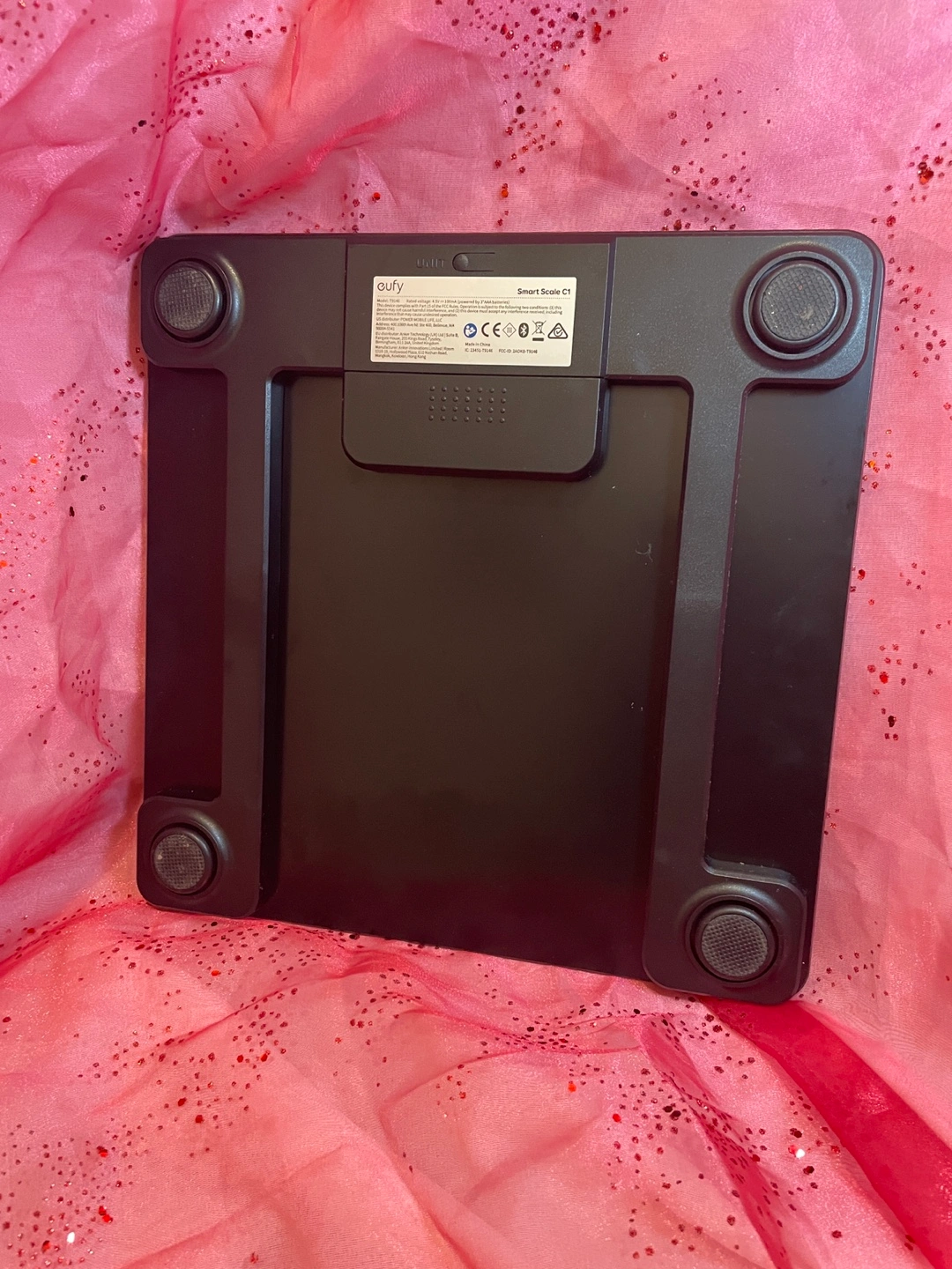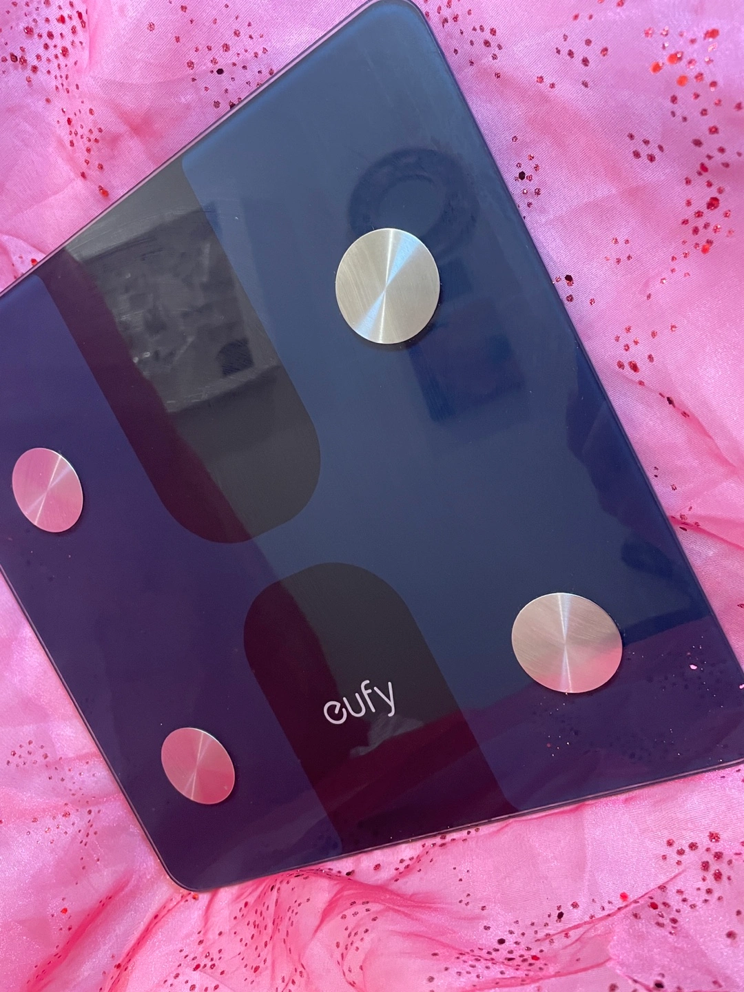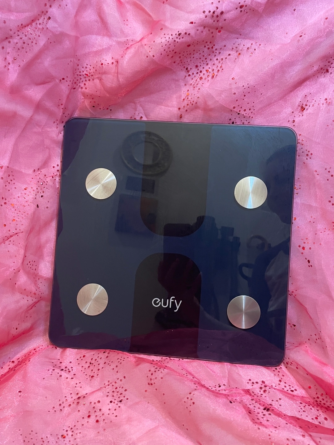 Eufy Smart Scale C1. Bluetooth enabled. Measures weight. Sleek dark glass design. Four metallic sensor pads. Used condition.