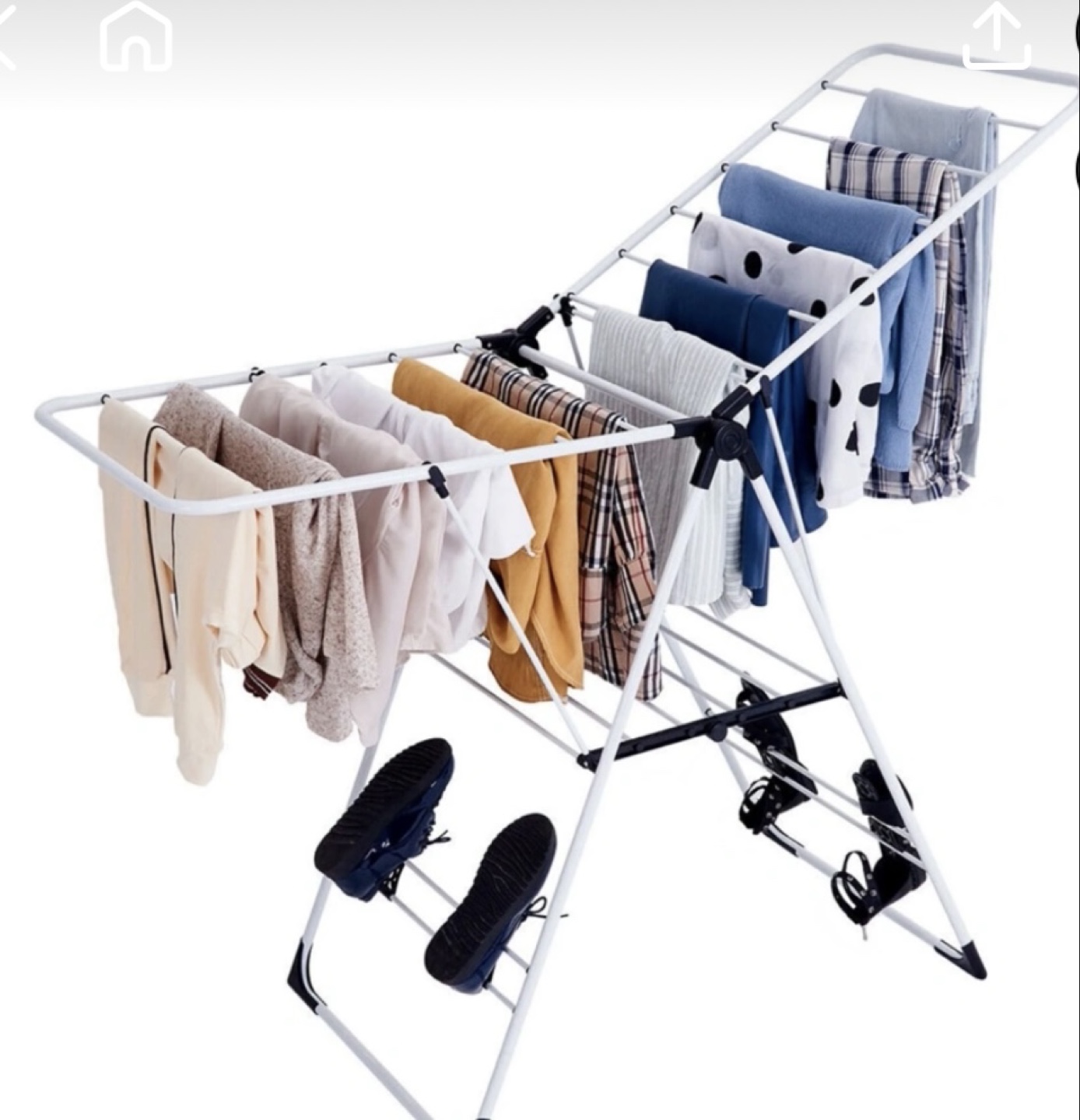 Large capacity drying rack. Multiple levels for hanging clothes and shoes. Folds for easy storage.