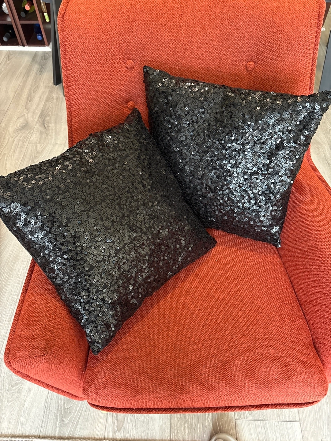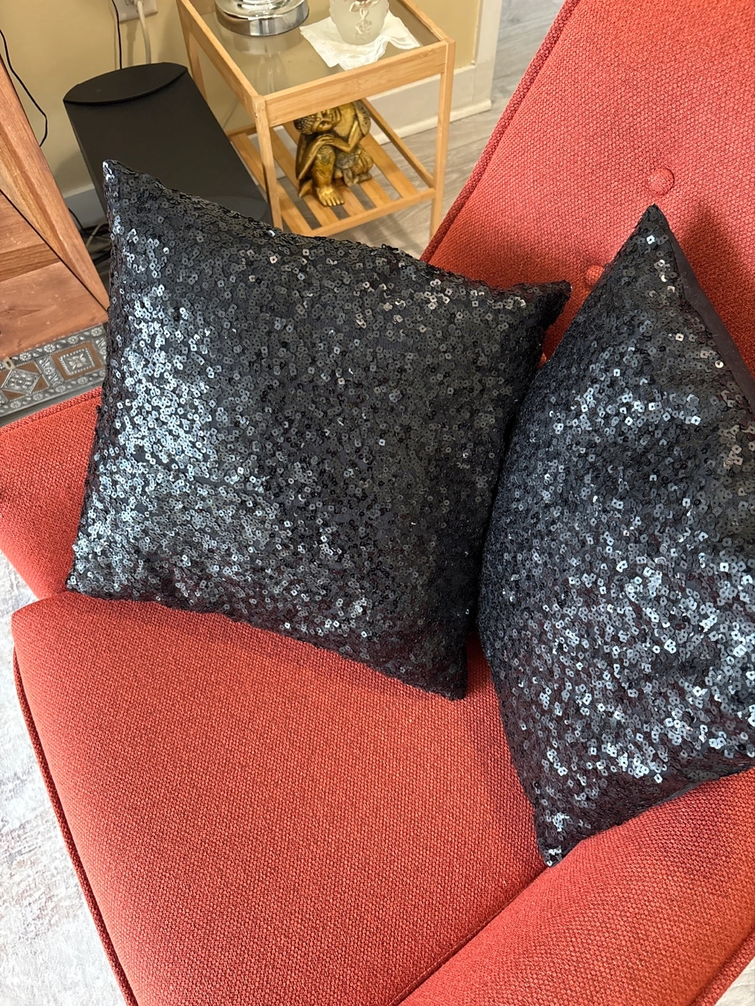Two black sequin throw pillows. Great for adding a touch of glamour to your living space. Soft texture. Perfect for a couch or bed.
