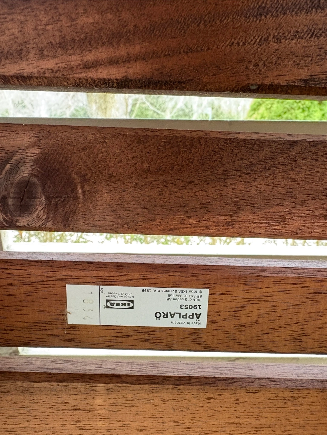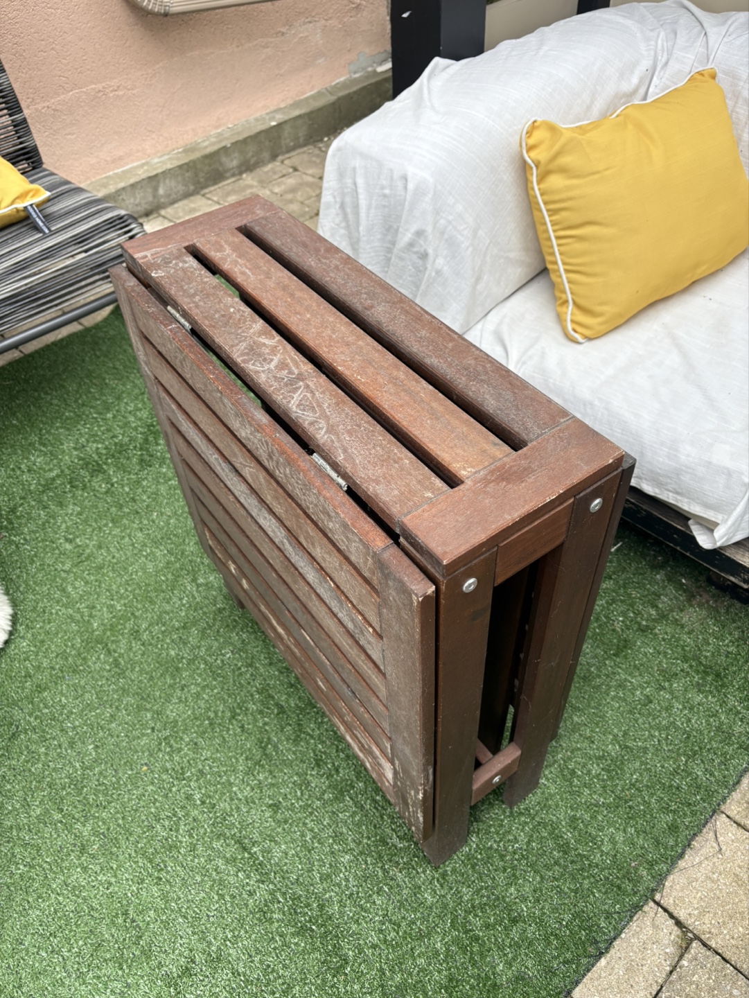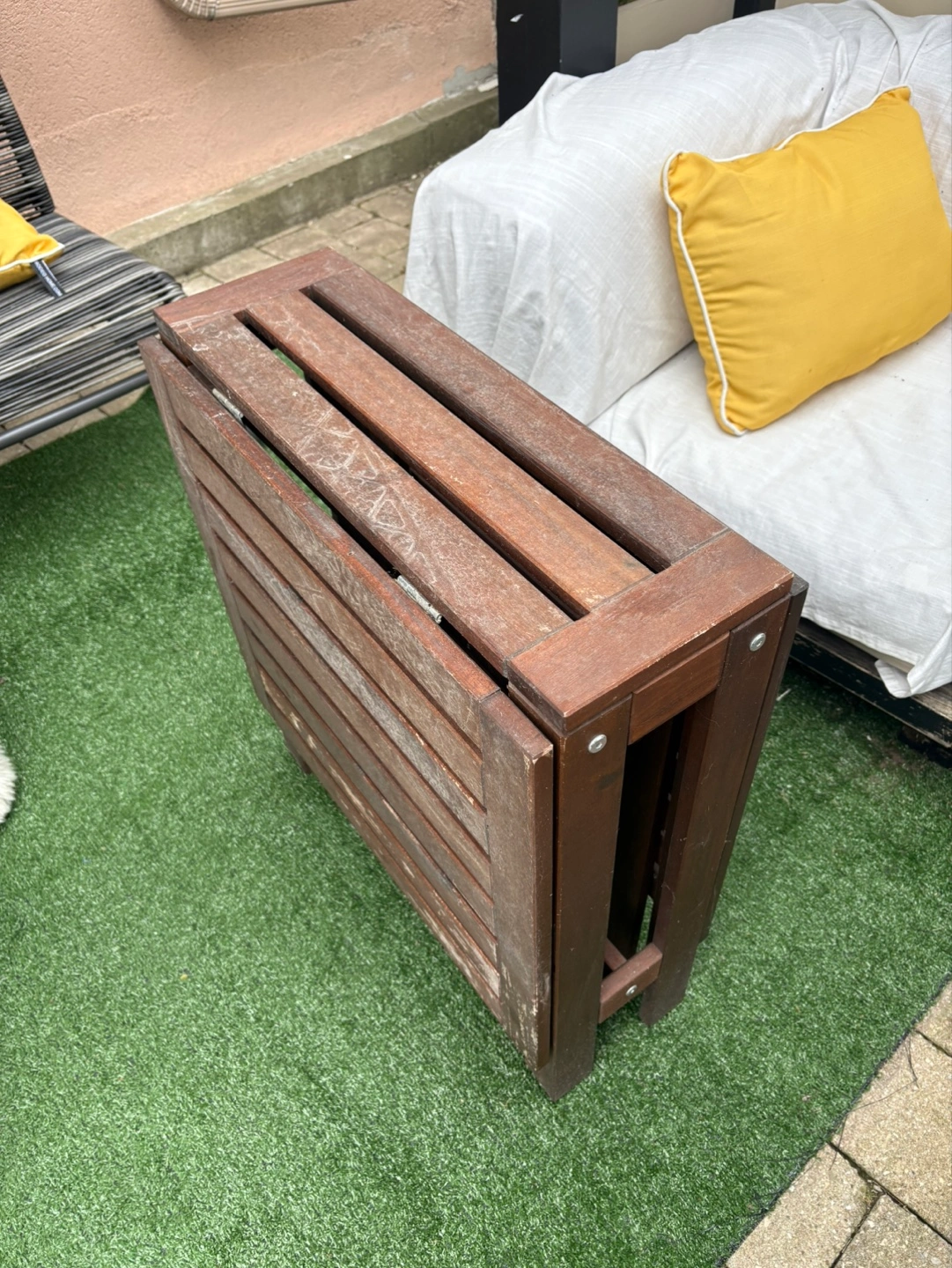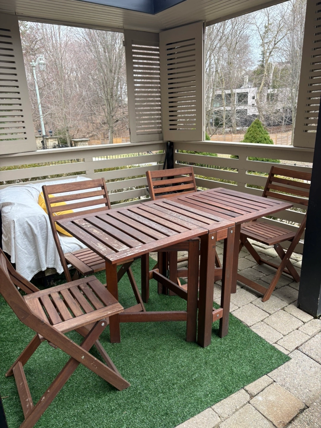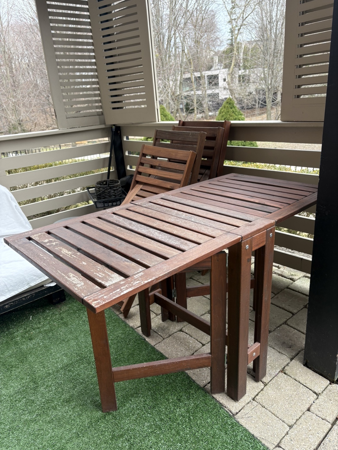 Wooden outdoor patio set. Includes a folding table and four folding chairs. Shows some wear from use. Great for small spaces. Can seat 2 or 4.