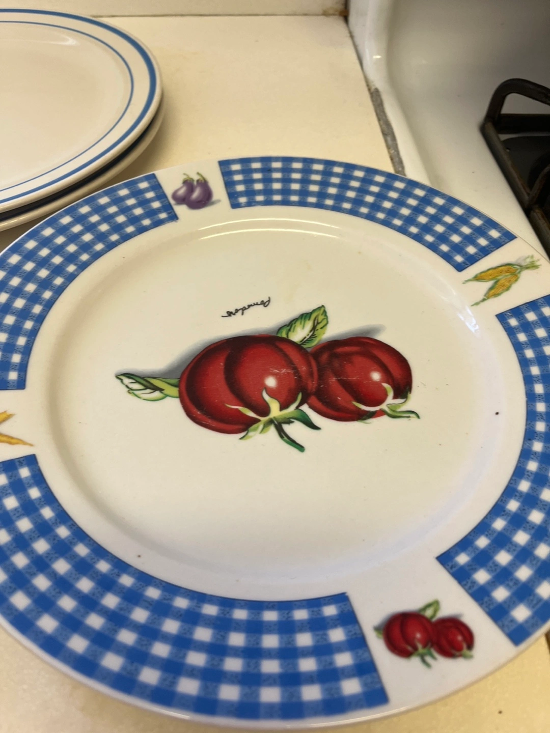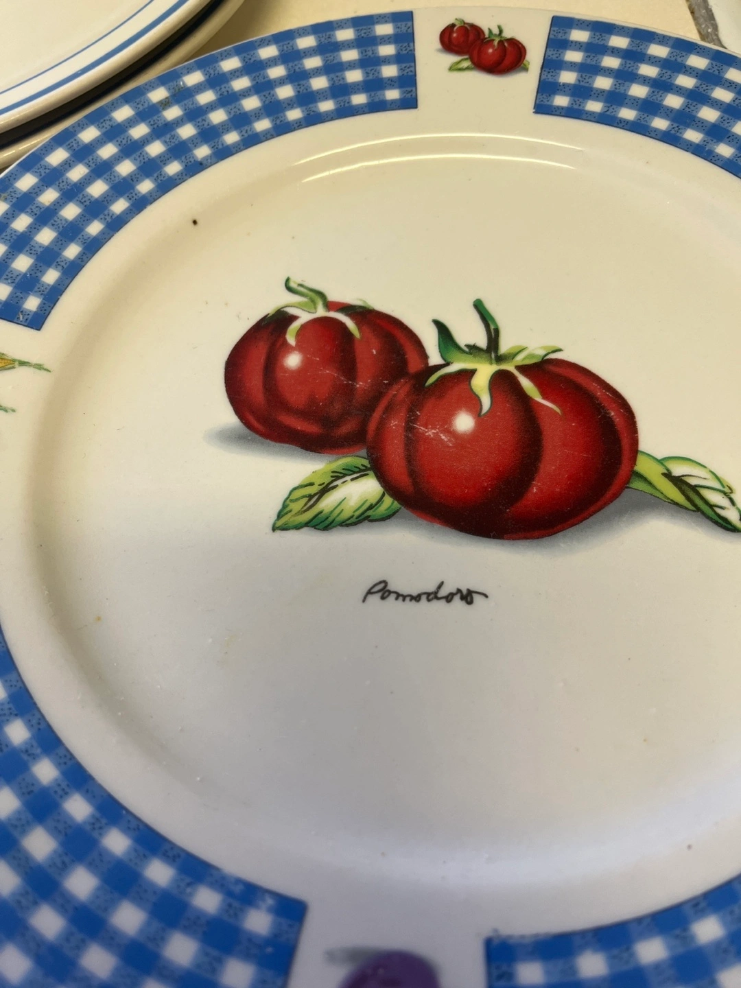Set of Six Salad Plates: Blue Swirl & Gingham Tomato Design