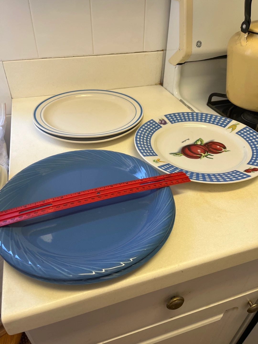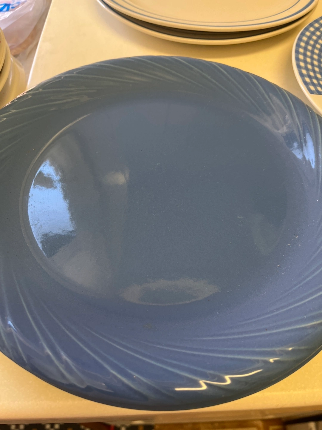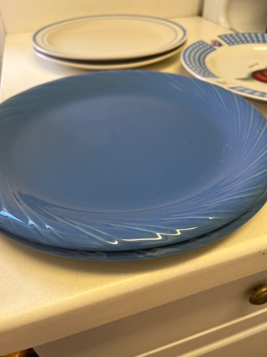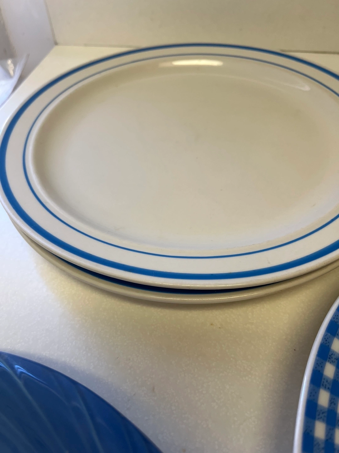 Five secondhand salad plates. Two solid blue swirl plates, two gingham border plates with tomato design, and one simple blue-rimmed plates. Nice set for casual dining.