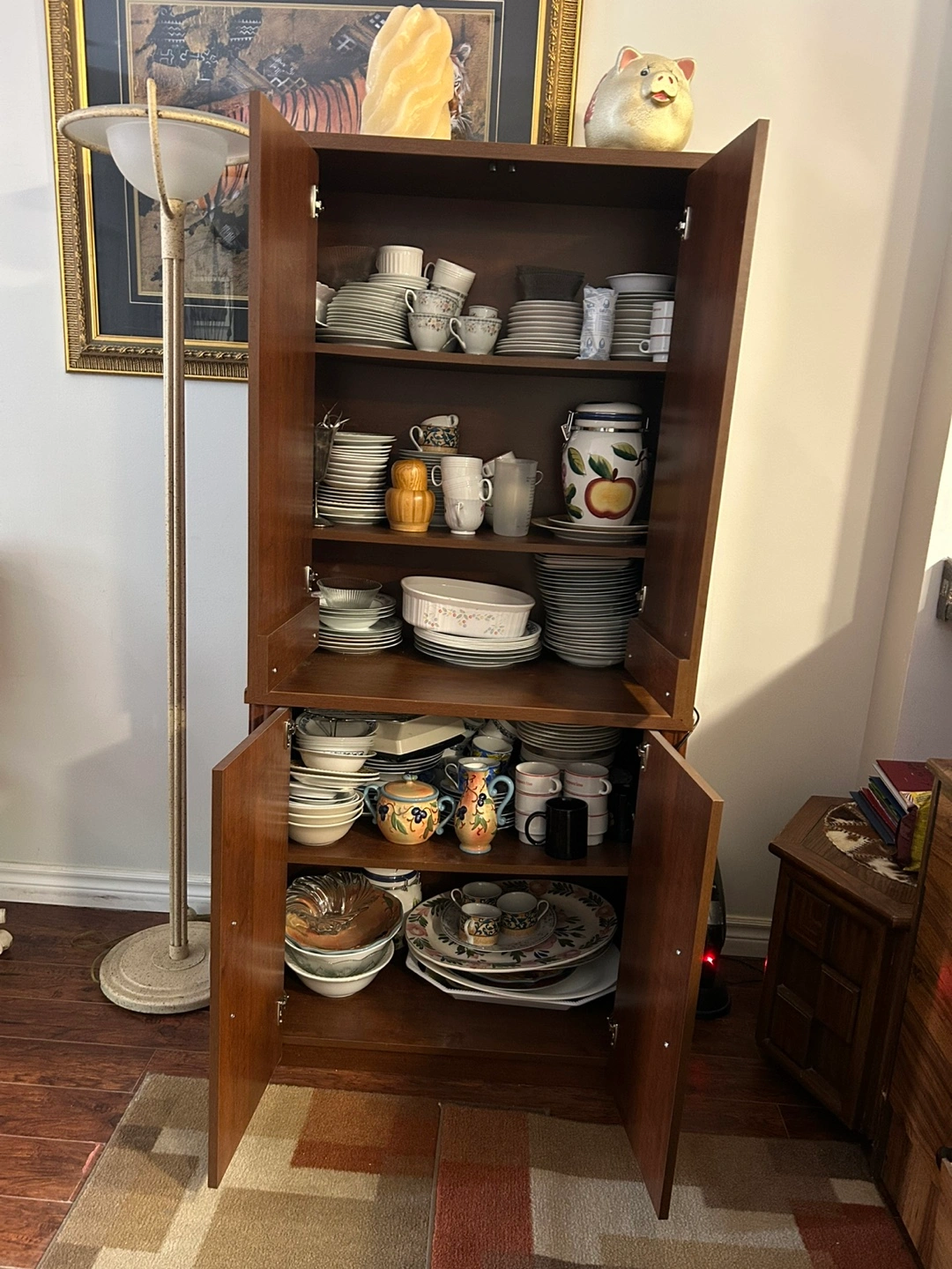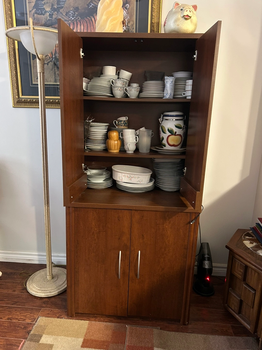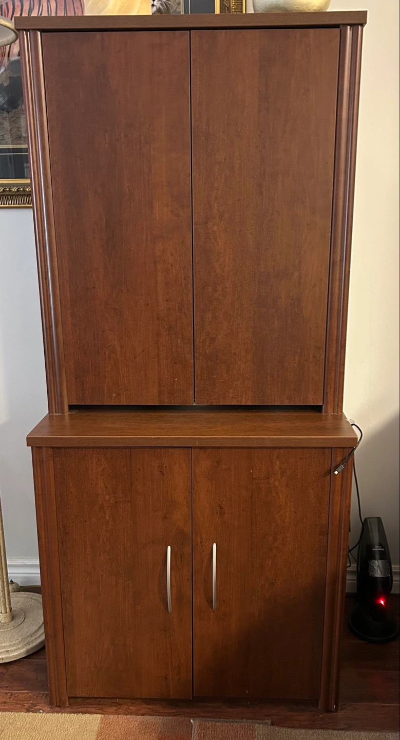 Tall, double-door cabinet. Two sections, upper and lower. Ample storage space. Great condition comes with everything inside if you want.