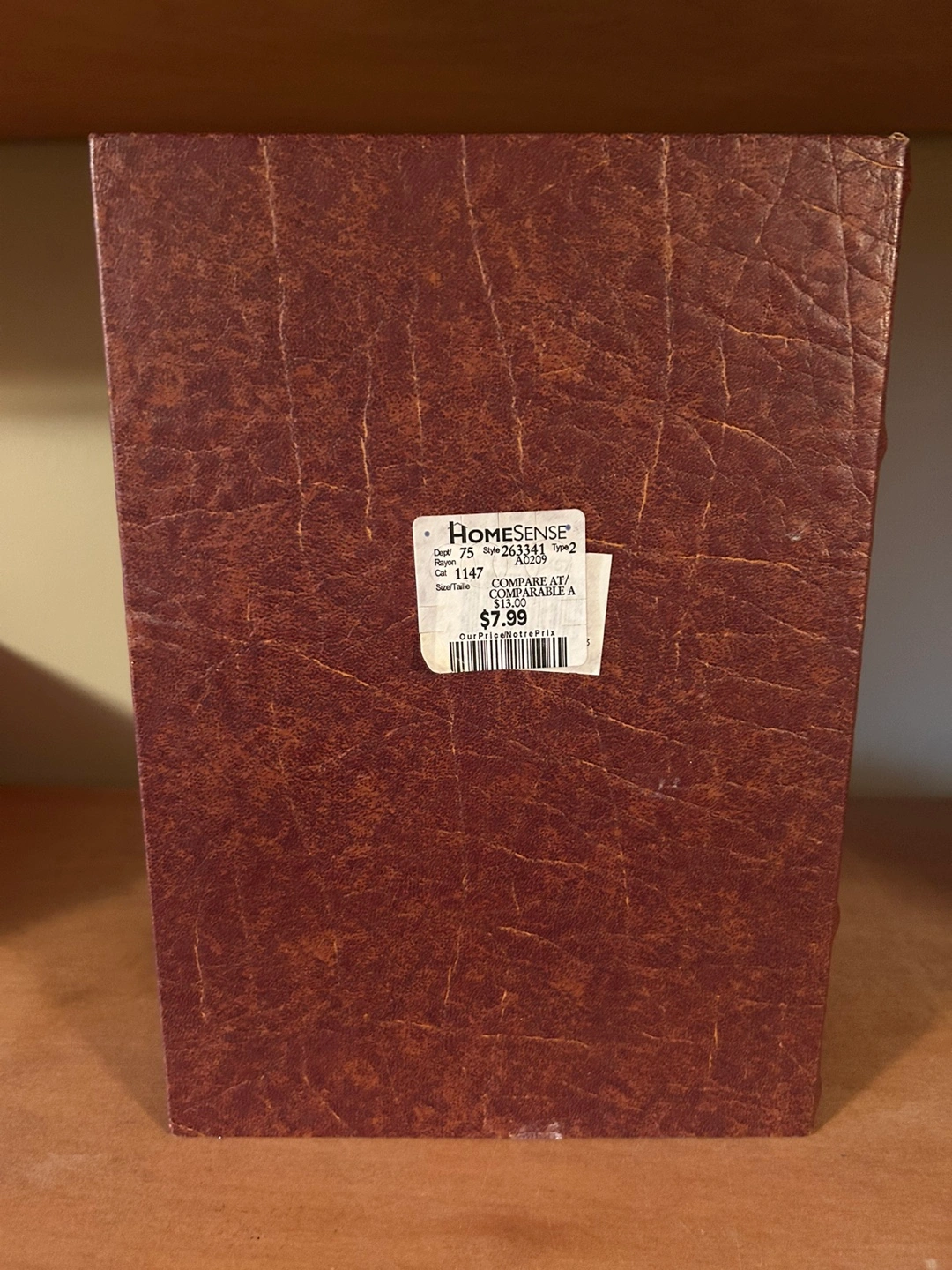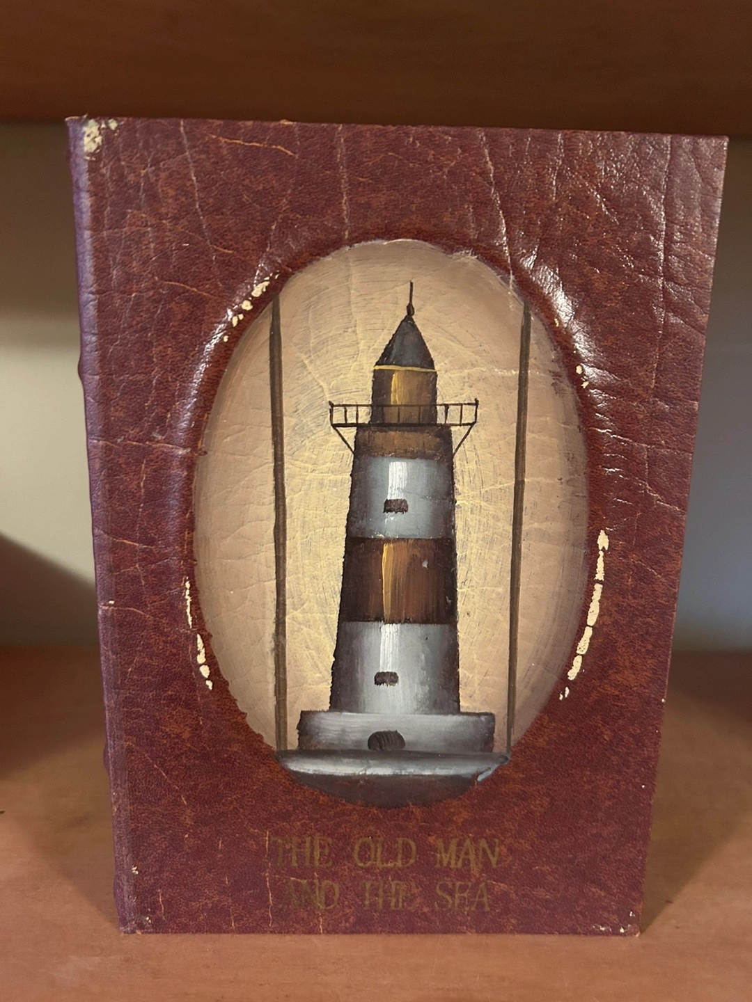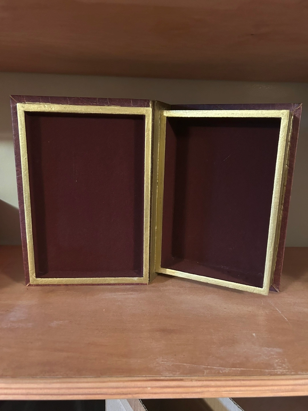 Decorative book box. Looks like a book. Brown leatherette cover. Gold accents. Lighthouse image. Interior is dark brown fabric. Hinged. Opens to reveal storage space.