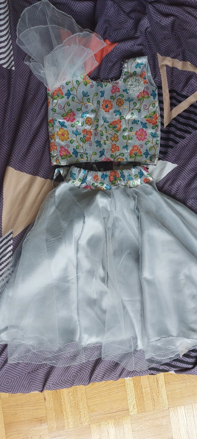 Beautiful grey lehenga choli. Floral print top, flowy skirt. Perfect for special occasions. Size not specified.