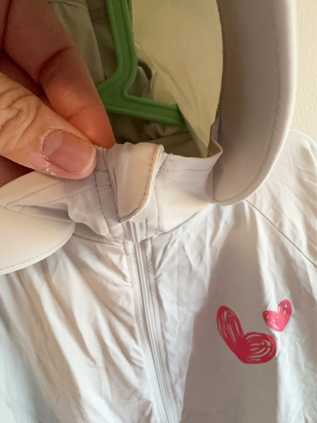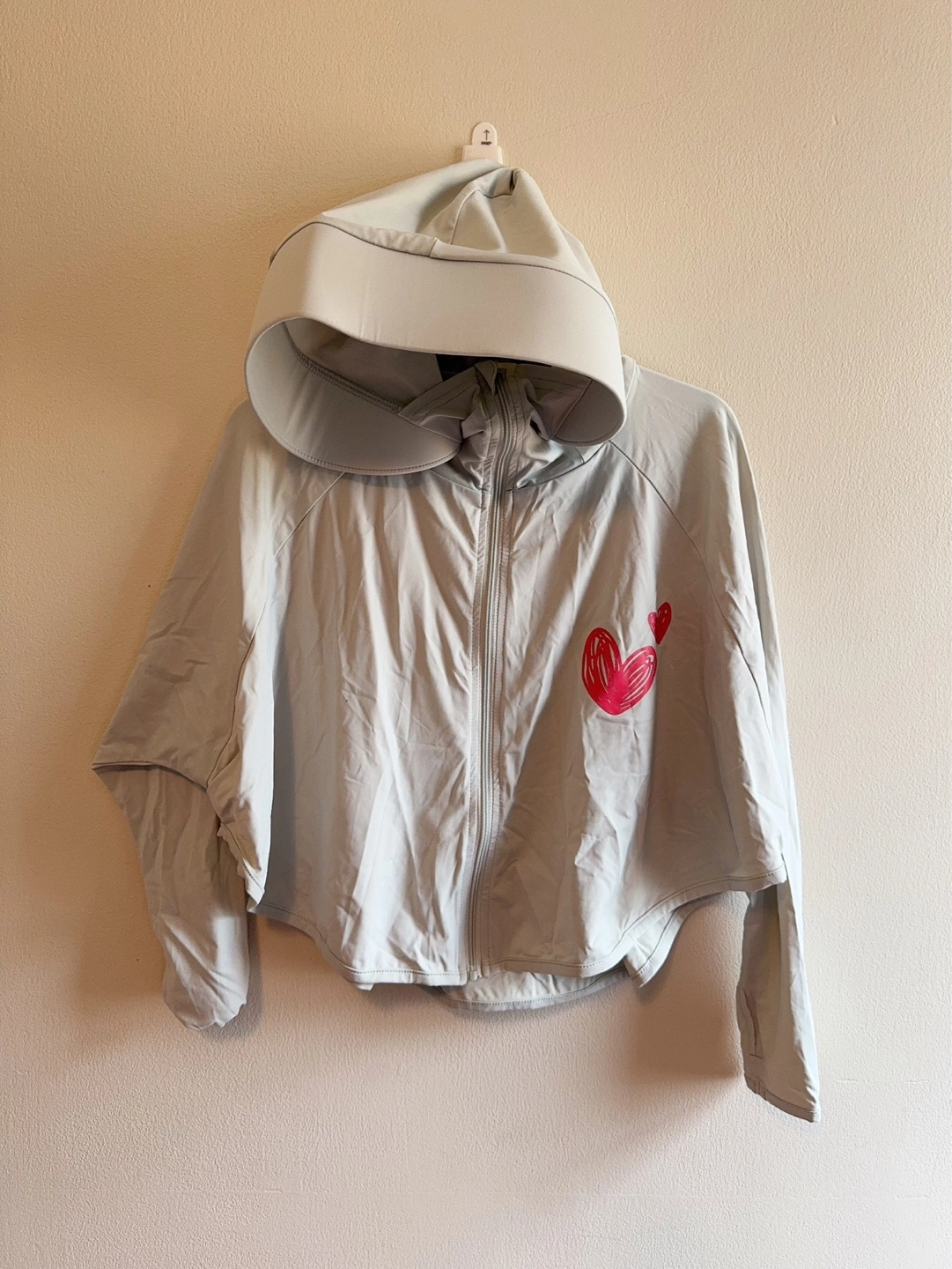 Anti-UV jacket. Features a hood and pink heart design. Lightweight and comfortable.