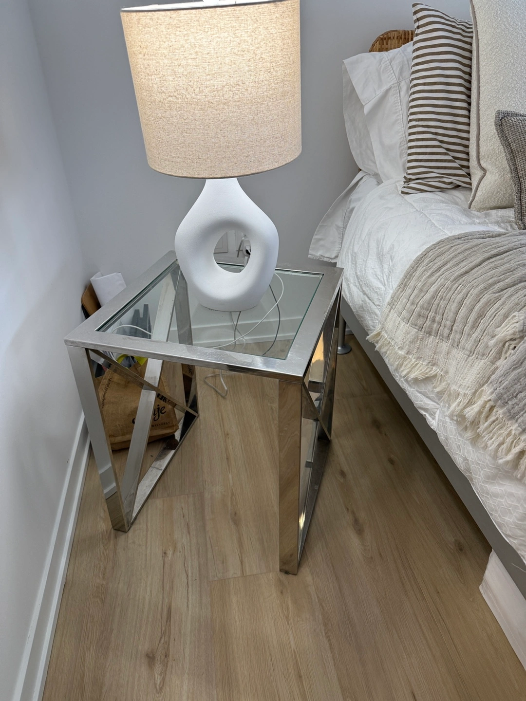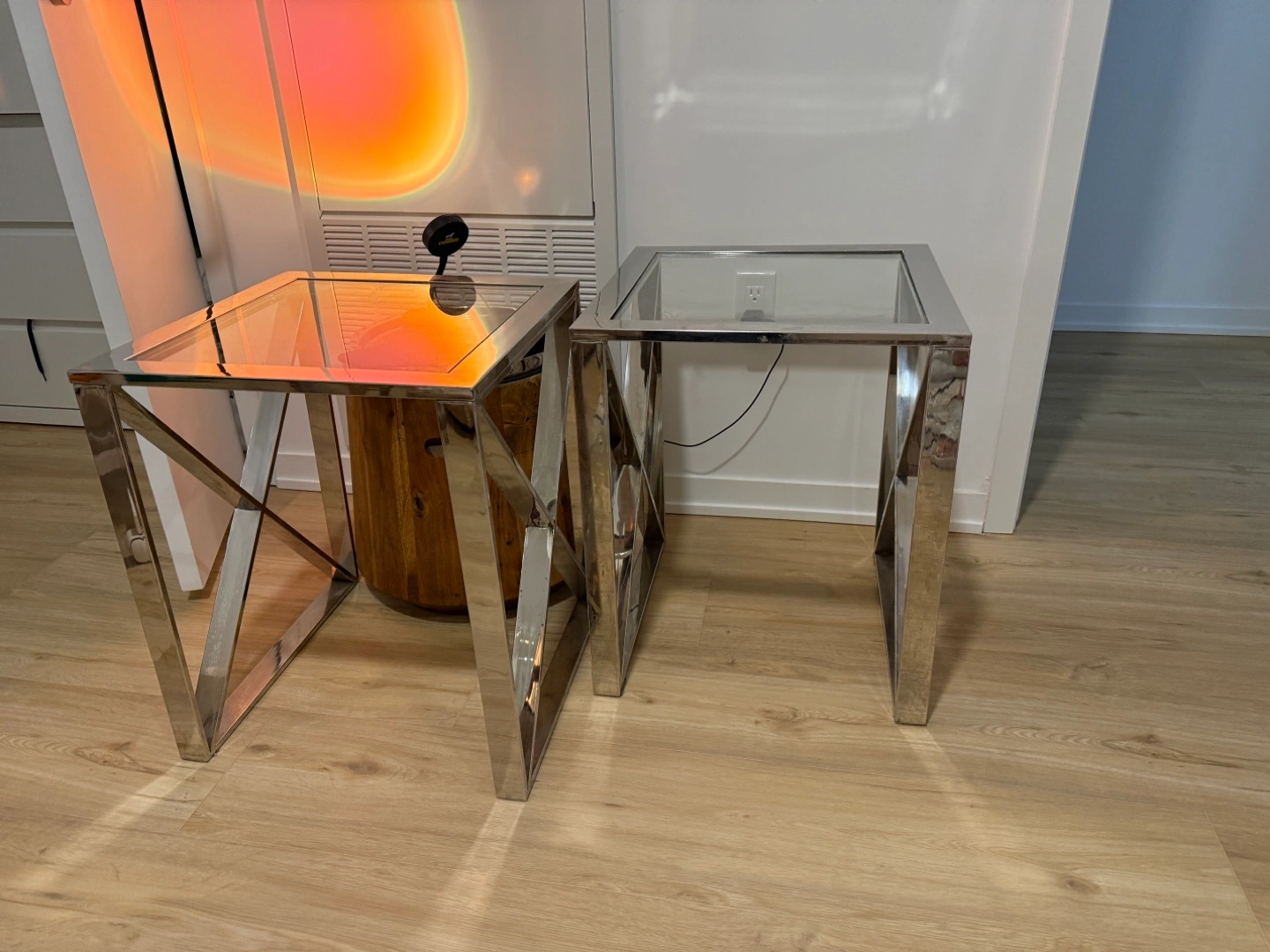Two square end tables. Chrome metal frame. Glass top. Modern design. Perfect for a bedroom or living room. $80 for both.