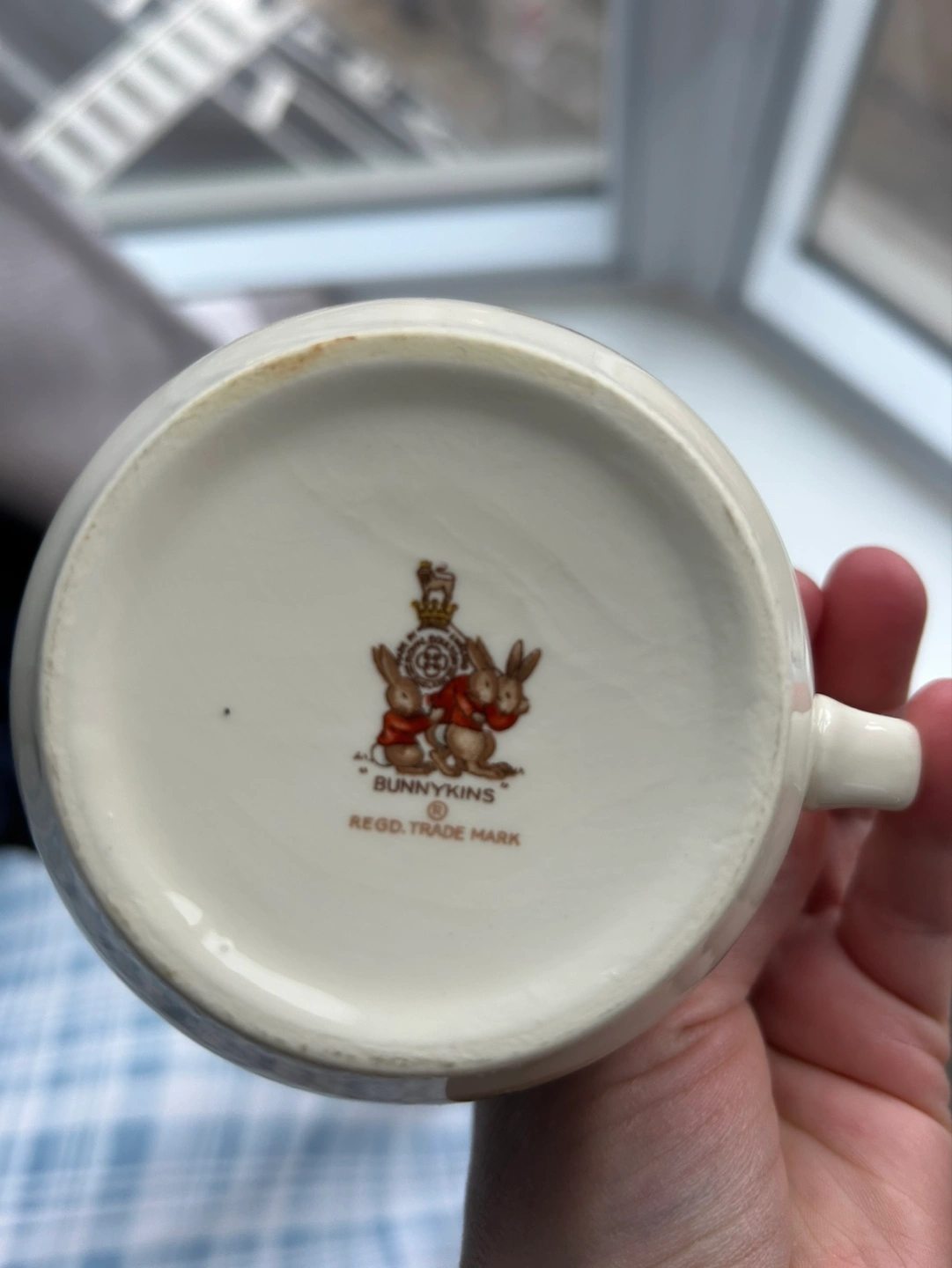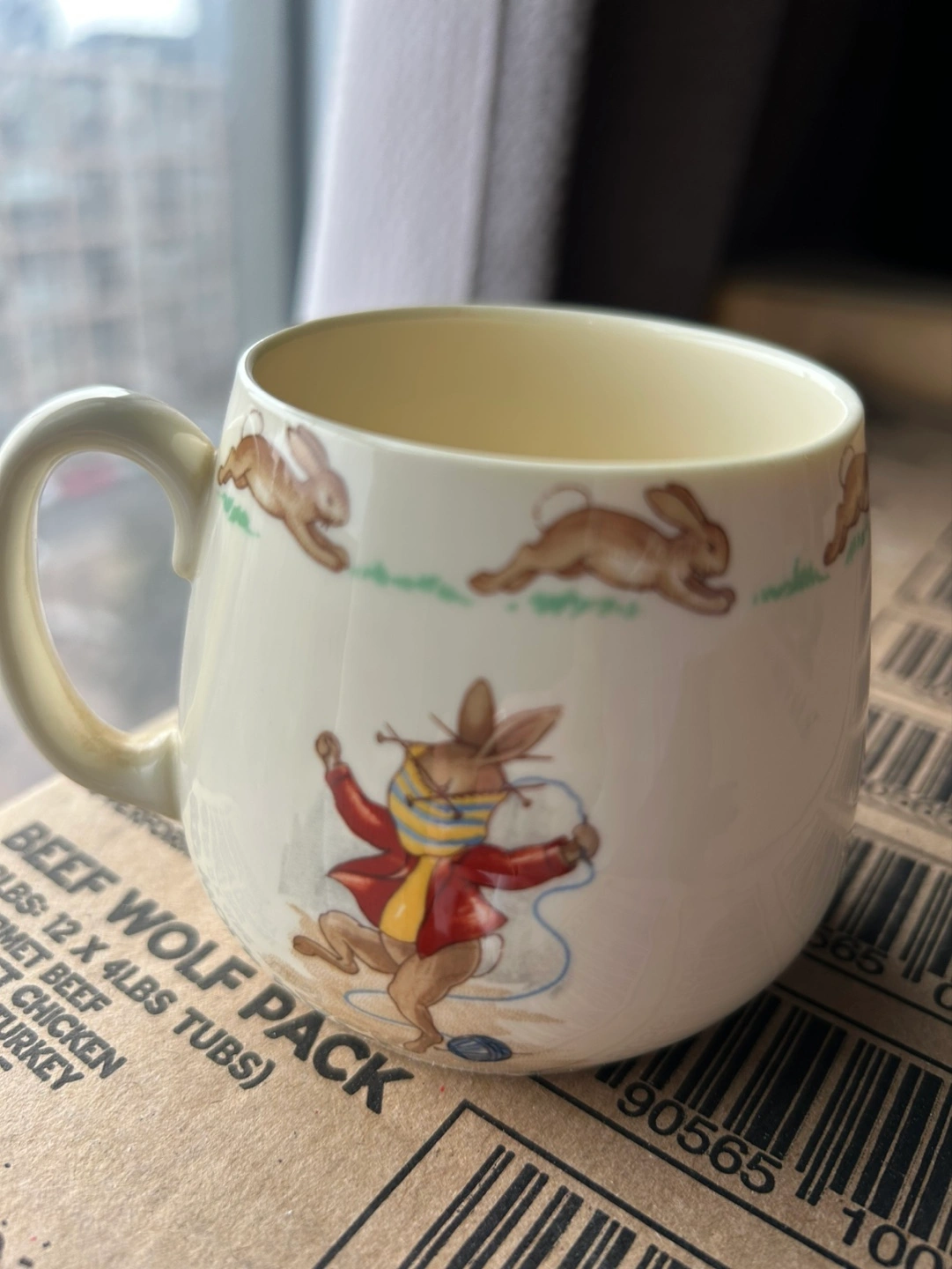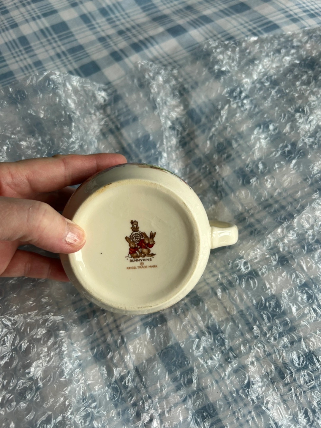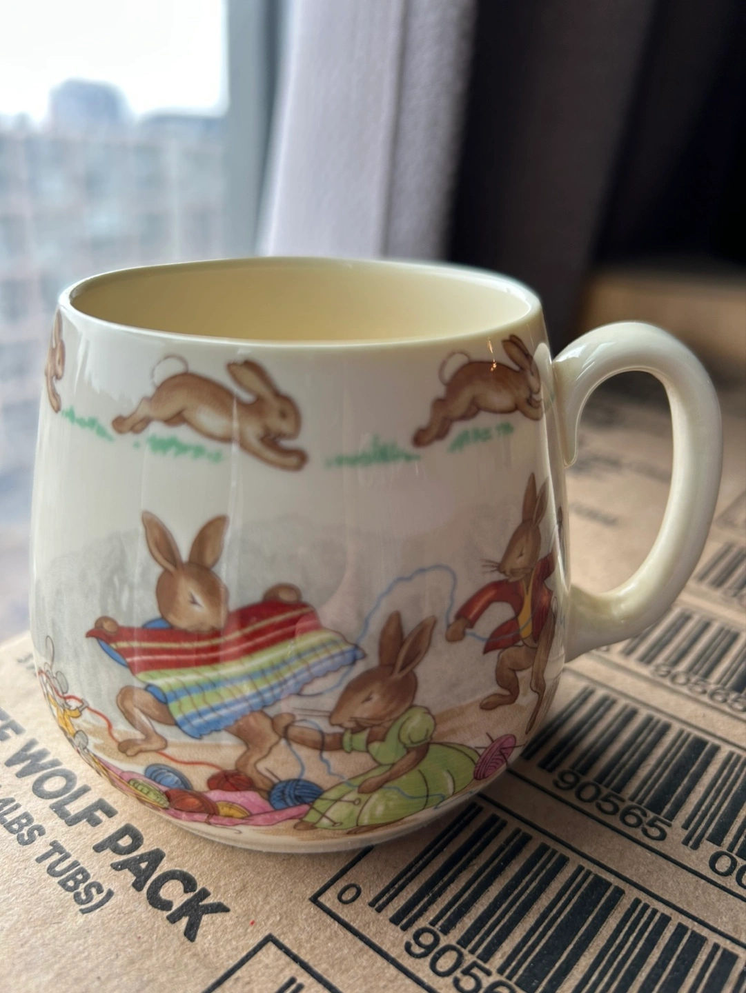 Adorable vintage Bunnykins mug. Features playful bunny knitting illustrations. Perfect for collectors or children.