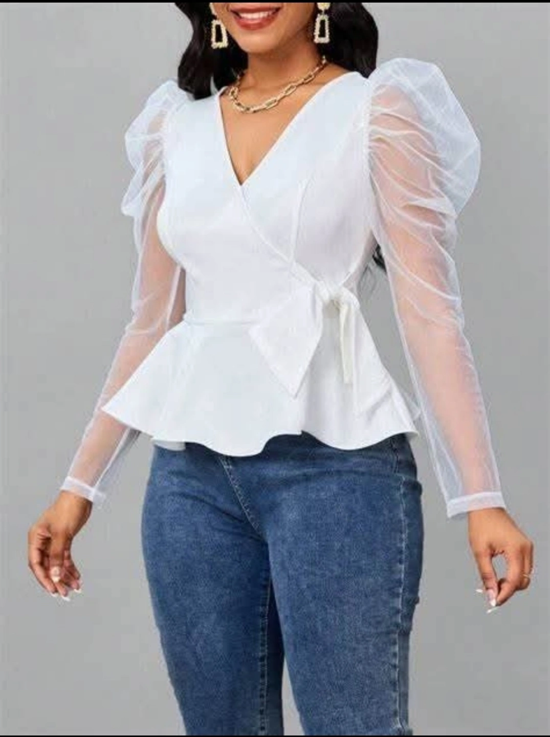 18Elegant white blouse. Features sheer puff sleeves and a wrap-style bodice. Peplum hem. Perfect for a special occasion.