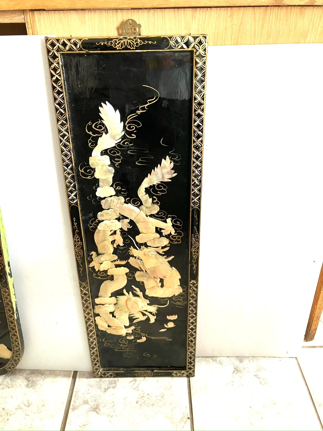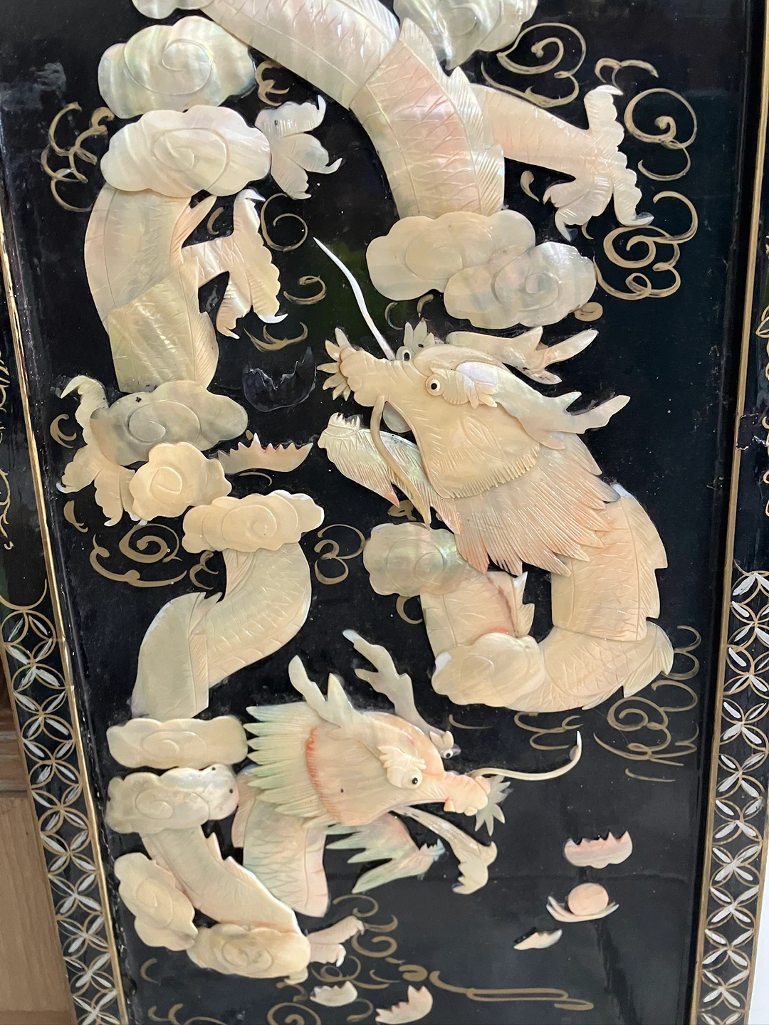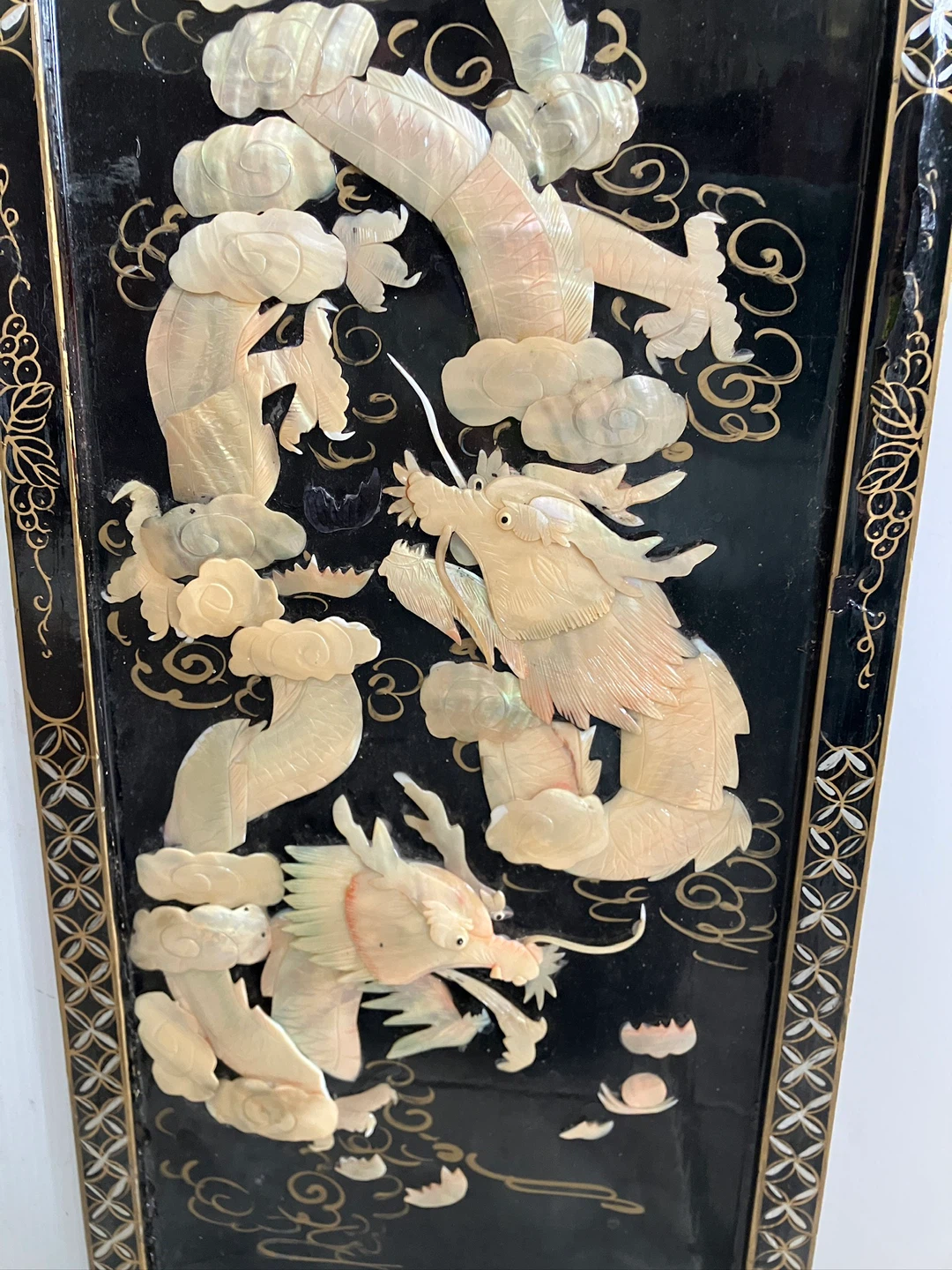 Chinese black lacquered panel featuring an intricate, raised design made of mother of pearl inlay