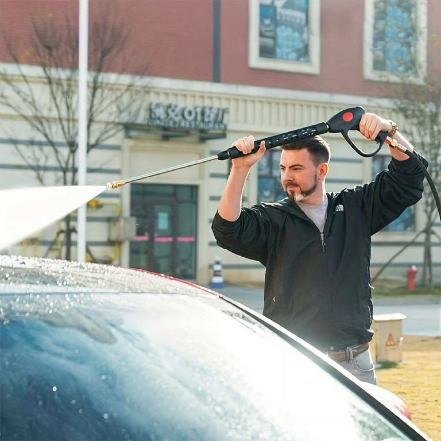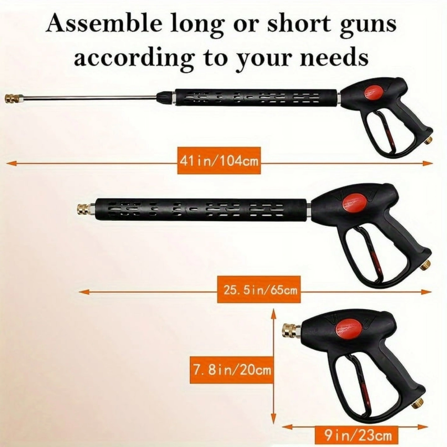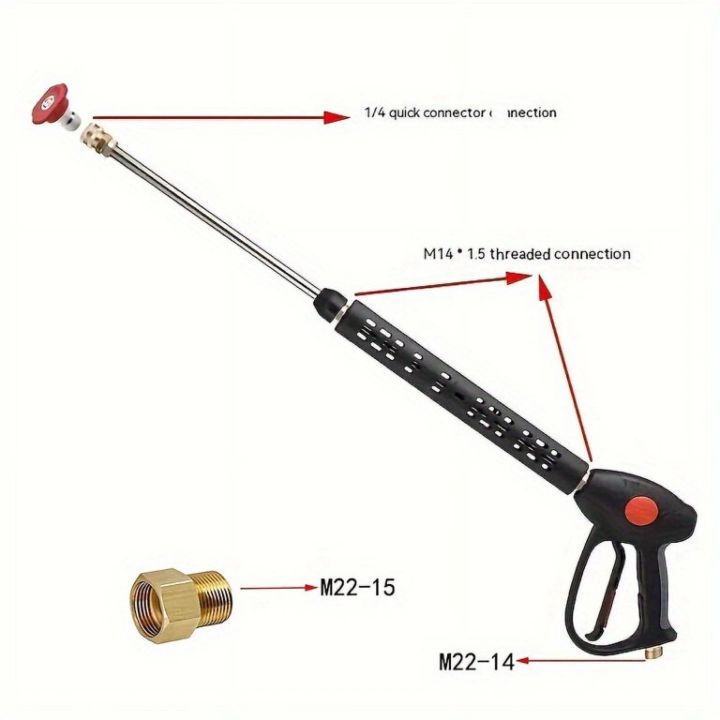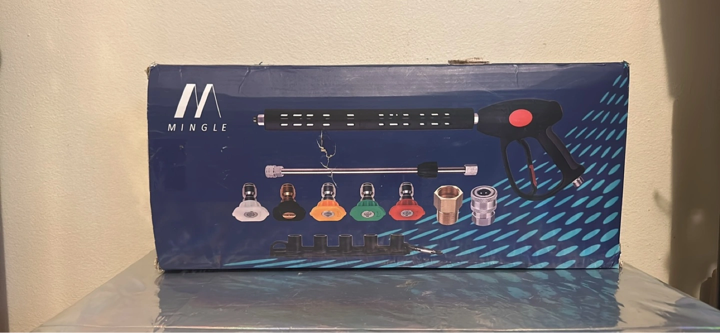 Pressure washer gun with multiple nozzles. Adjustable length wand. Includes various spray tips for different cleaning needs. Connects to standard pressure washer hose, not garden hose. Great for cleaning cars, decks, and more.