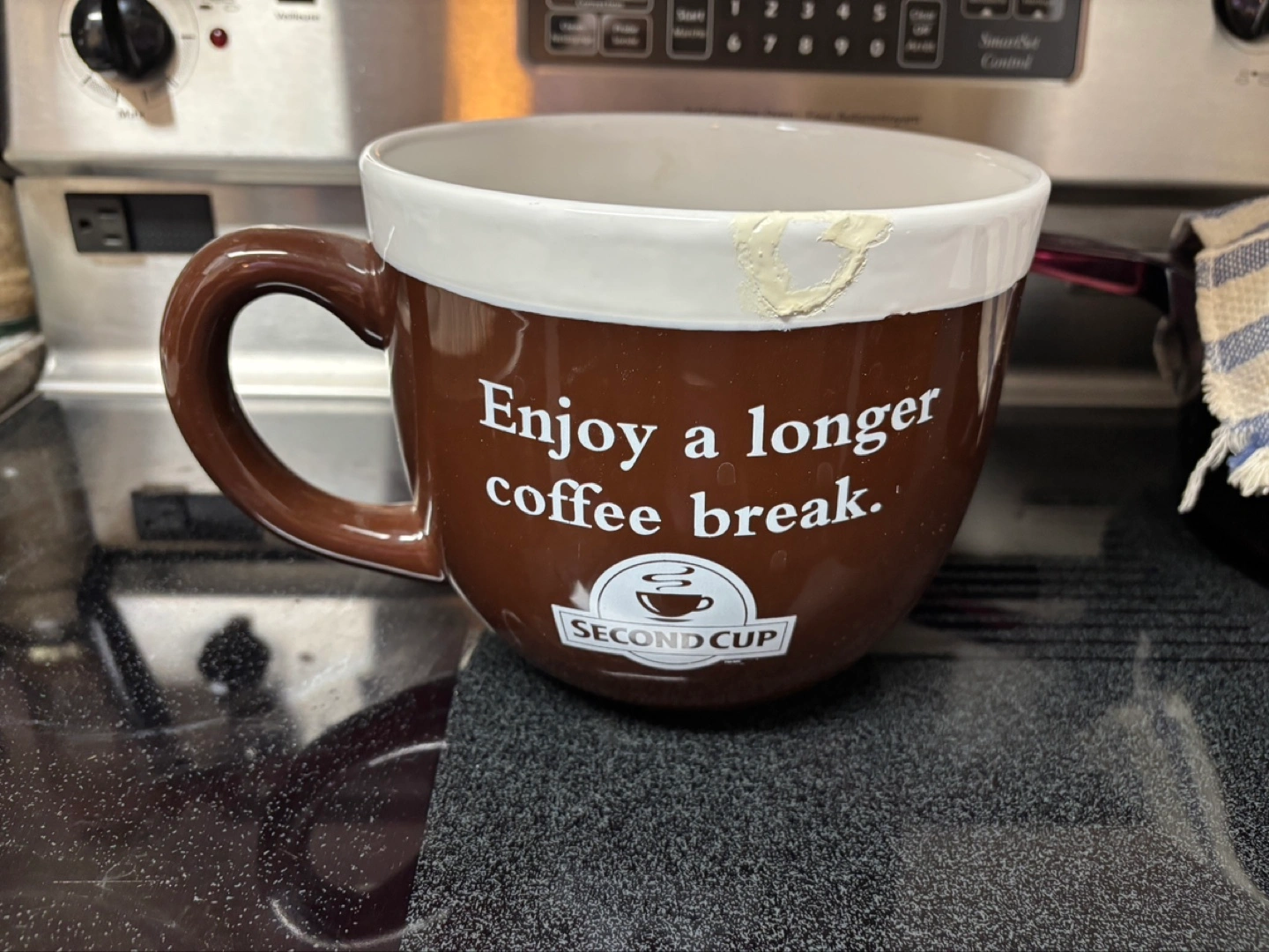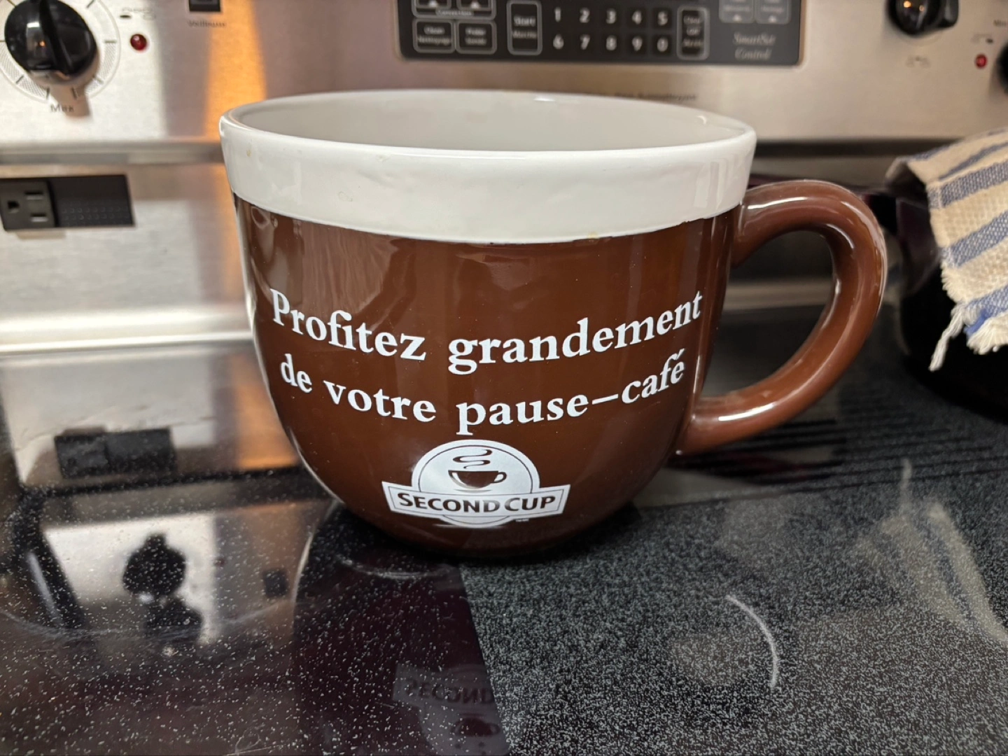 GIANT brown Second Cup ceramic coffee mug/tea cup. Features English and French slogans. Minor cosmetic damage visible on one side. Approximately 10cm (7’) diameter. About 6’ tall.