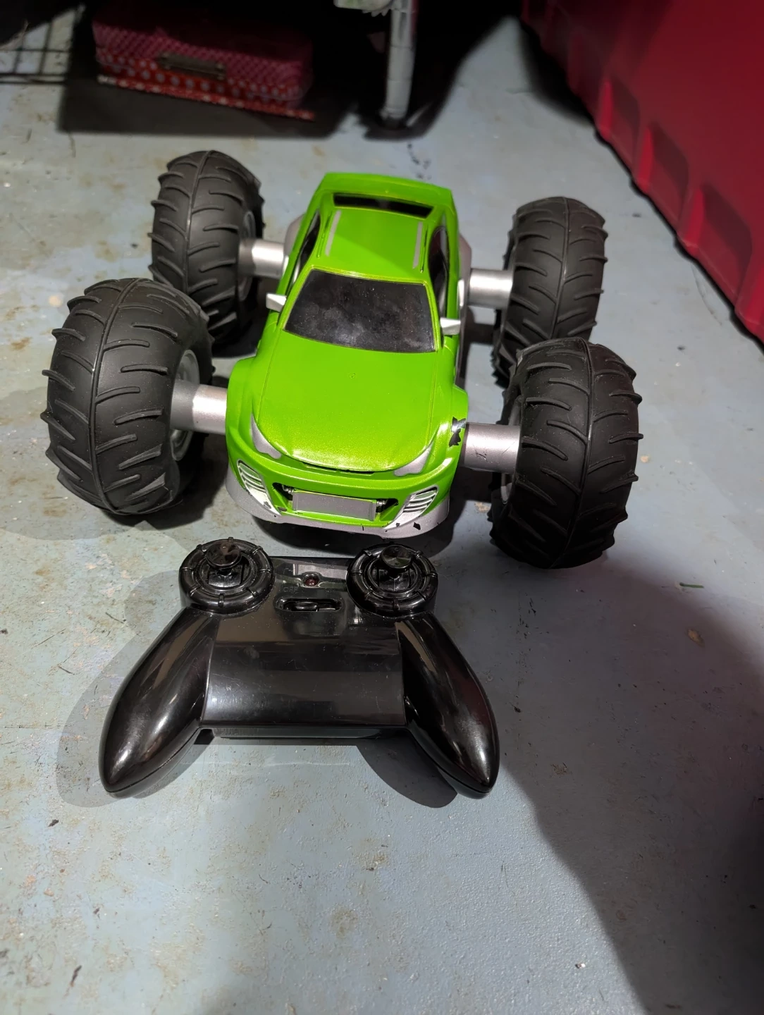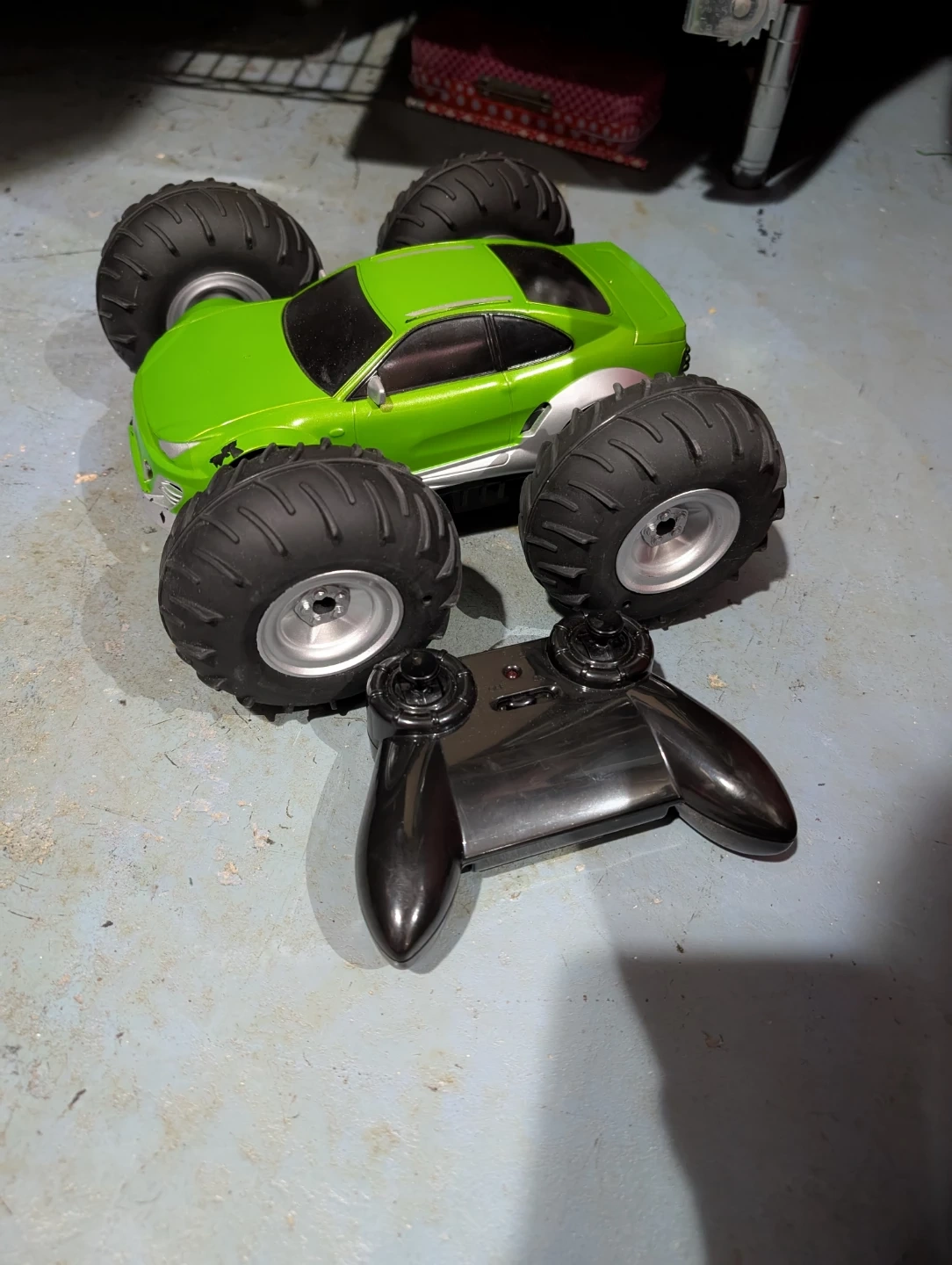 Green monster truck with large wheels and remote control. Barly used. Good working condition. Comes with rechargable battery and charger.