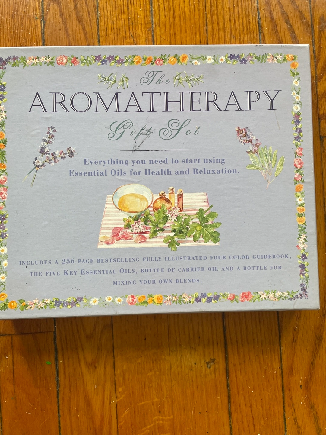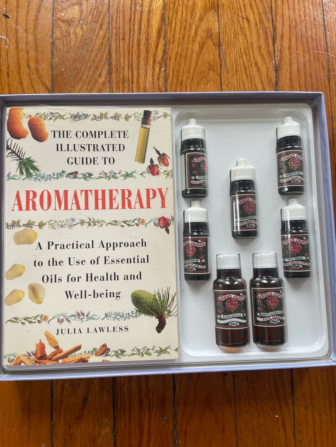 Complete aromatherapy gift set. Includes a 256-page illustrated guidebook, five essential oils, and a bottle for mixing blends. Perfect for beginners.