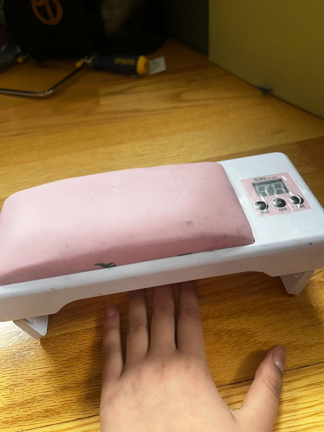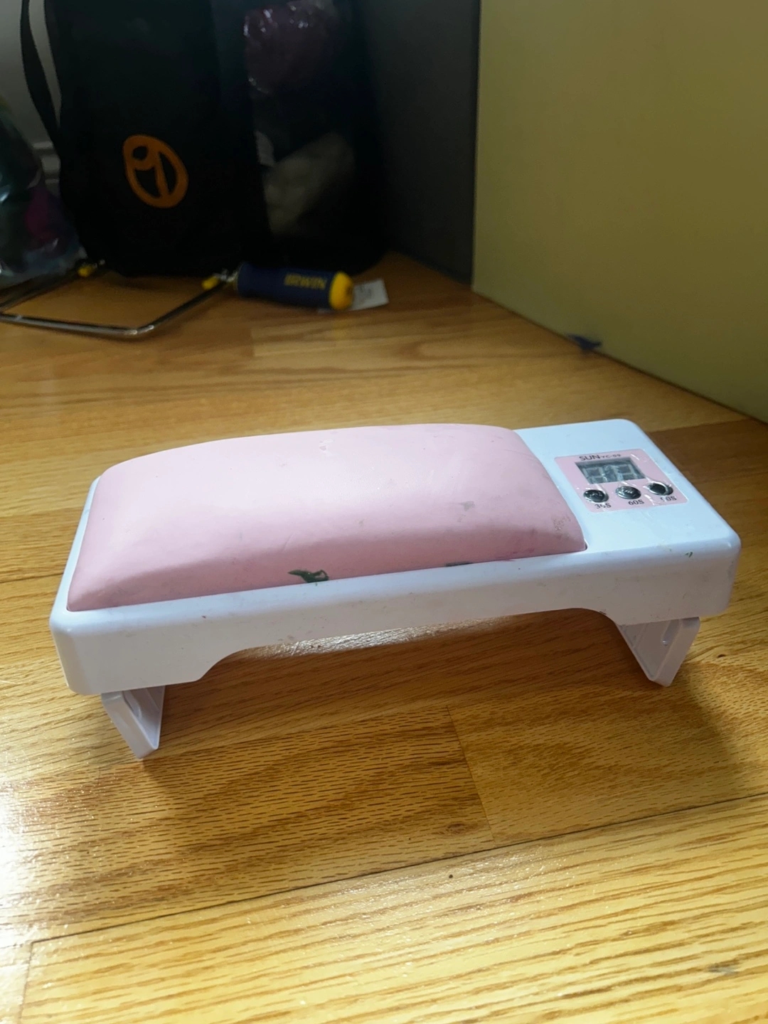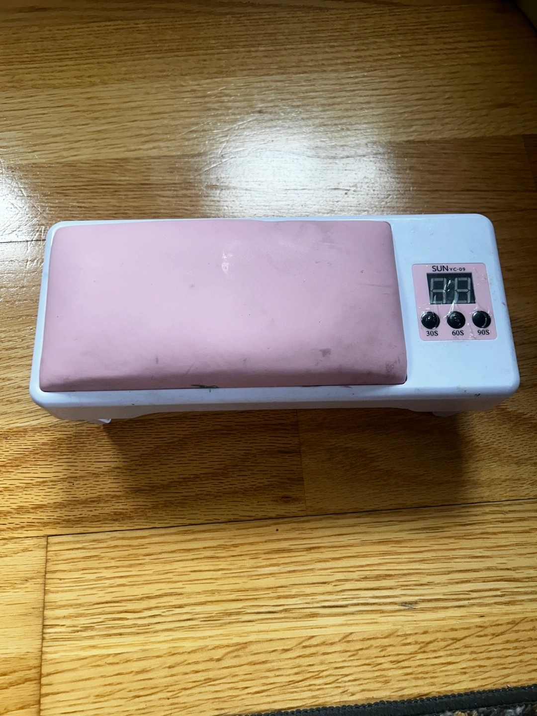 Used UV nail lamp. Pink cushion top, white base. Digital timer with 30s, 60s, and 90s settings. Some minor stains. Comes with plug.