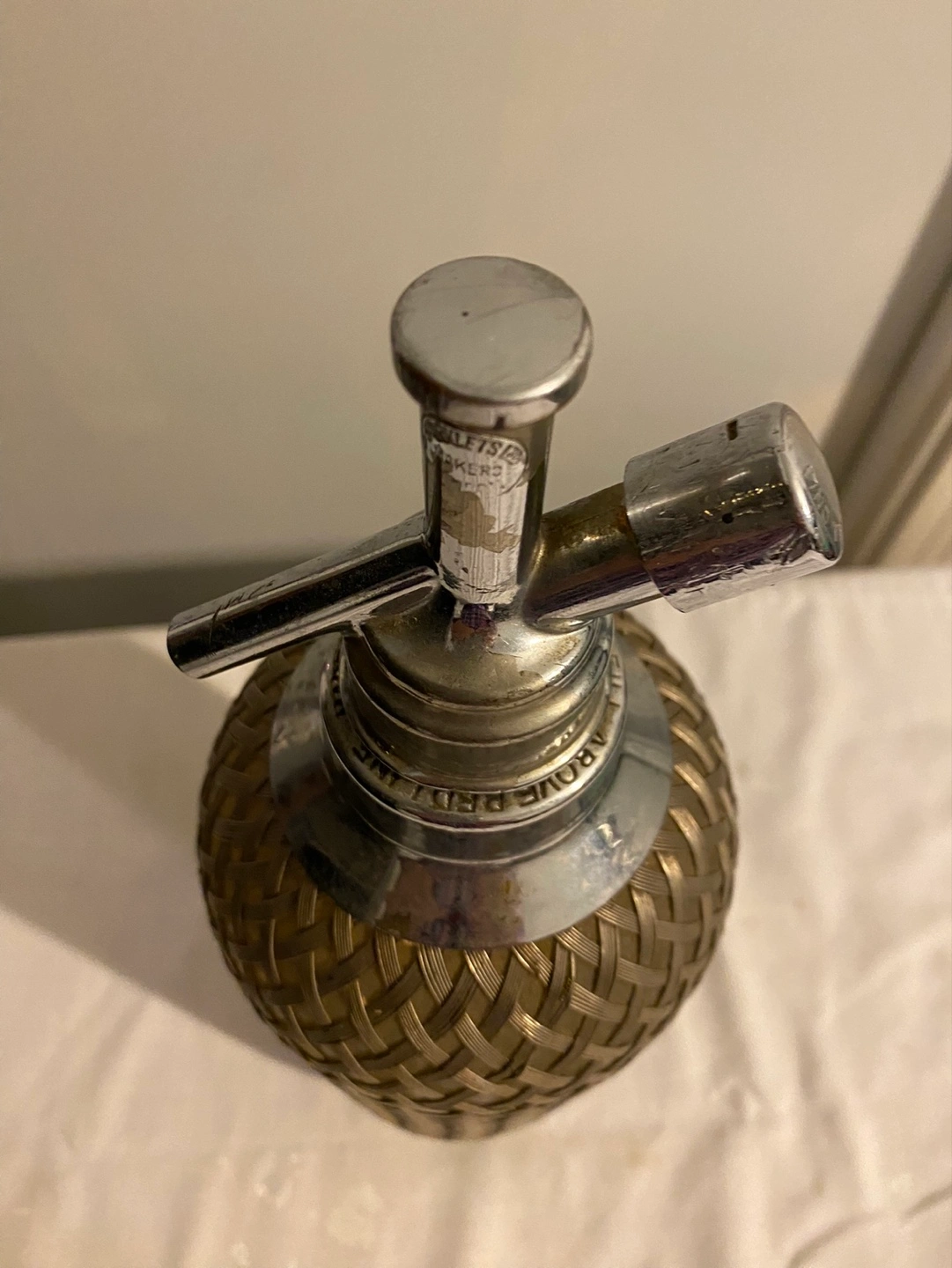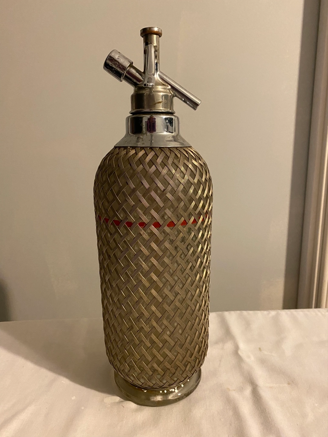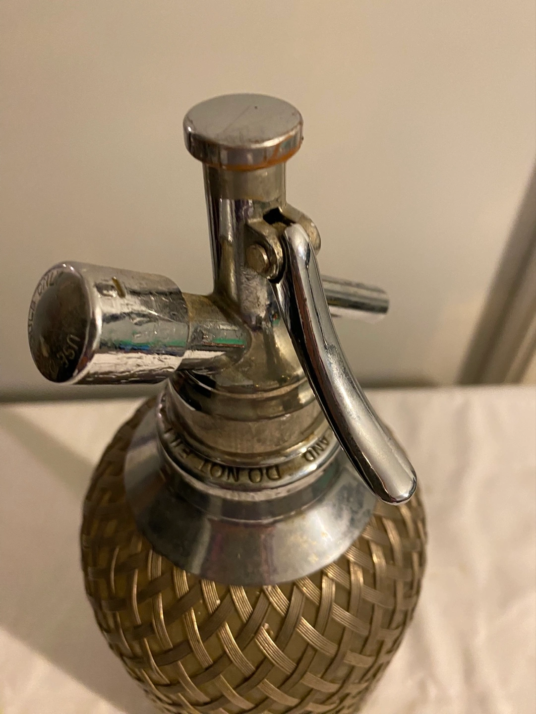 Antique soda siphon bottle. Chrome metal top with a metal mesh covered body. Unique design. Great collectible.
