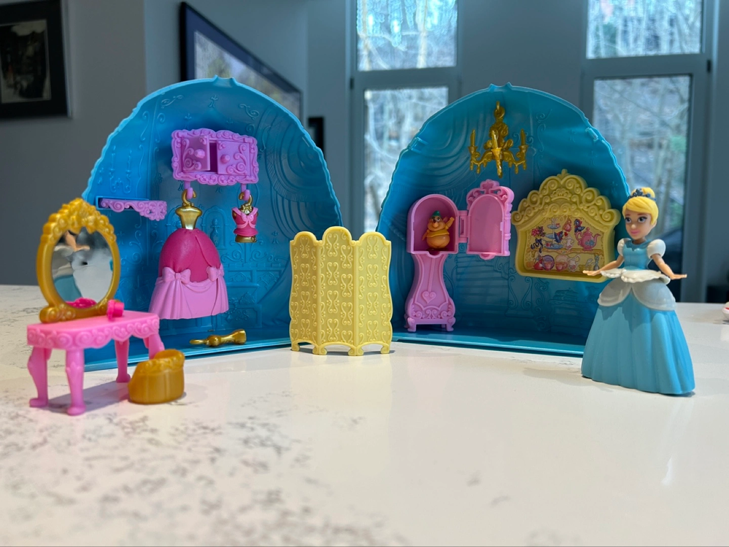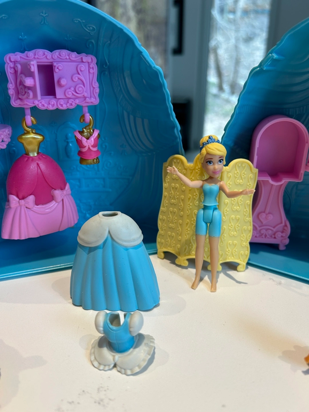 Adorable Cinderella playset. It is a portable closet, with the Cinderella doll, a Gus Gus figurine, 2 full princess outfits, a hair brush, a makeup table and golden pouf… So cute! It packs up in a cute display with the box looking like Cinderella’s dress.