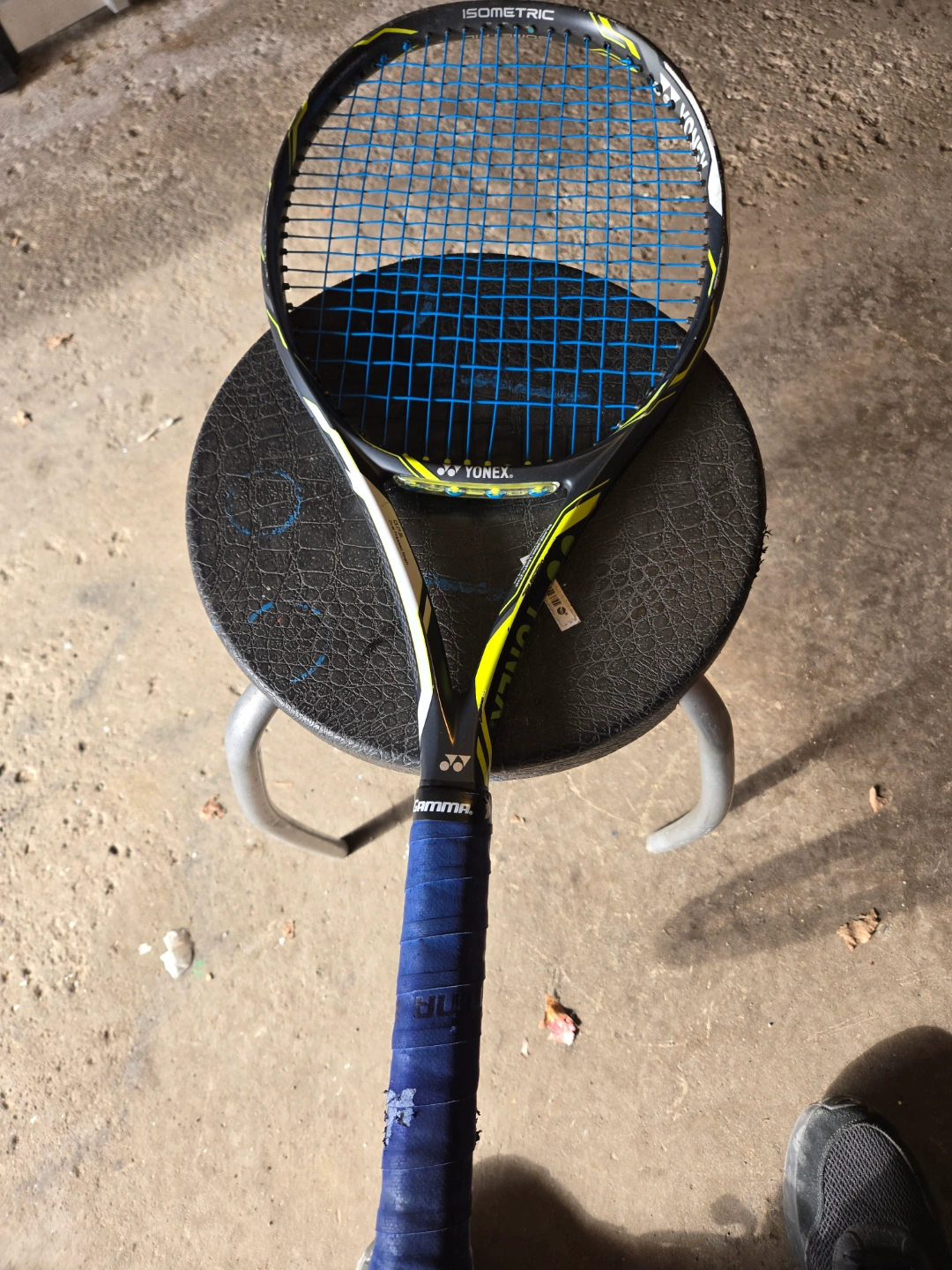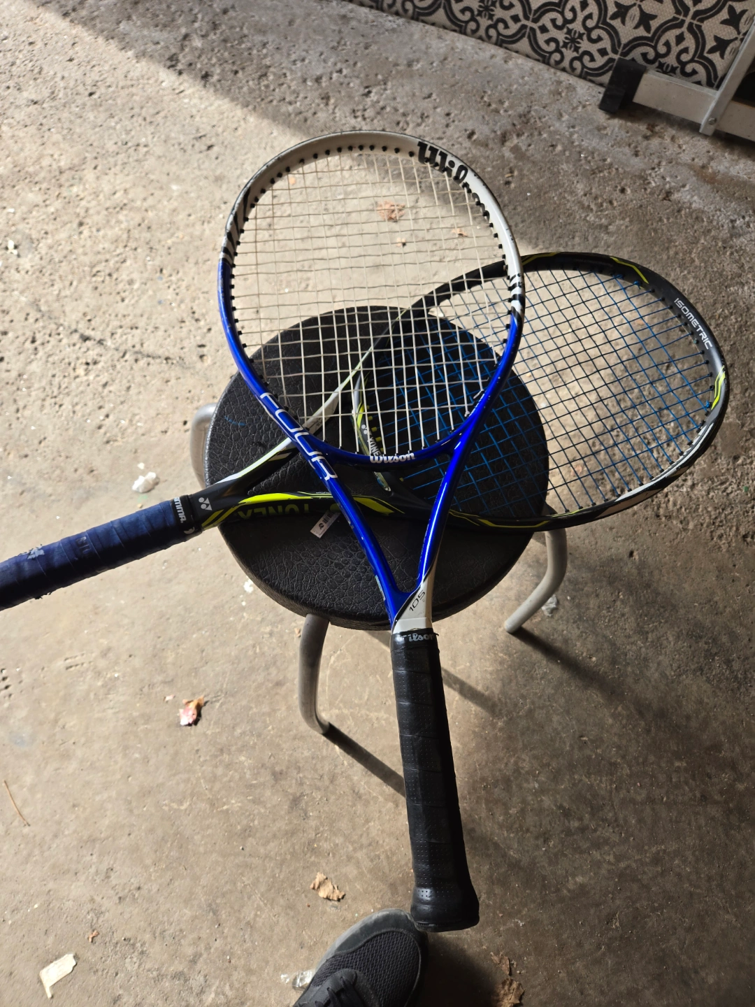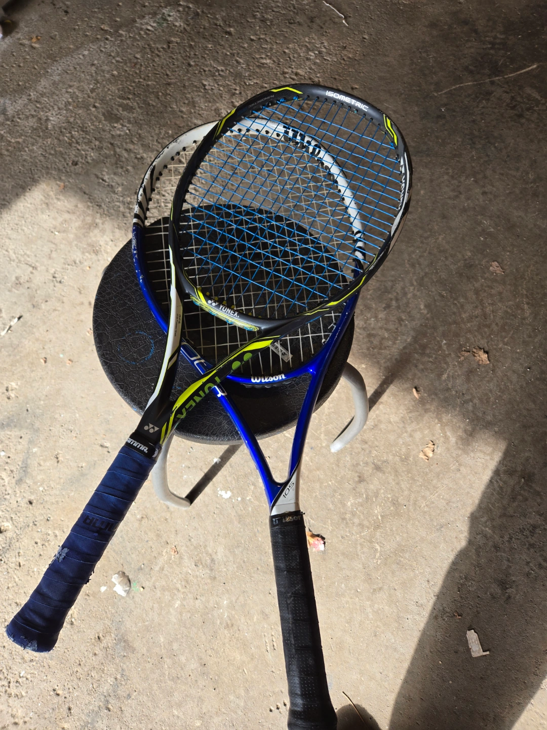 Pair of pre-owned tennis racquets. One Wilson and one Yonex. Good condition, some wear and tear. Grips show use. Great for practice or casual play.