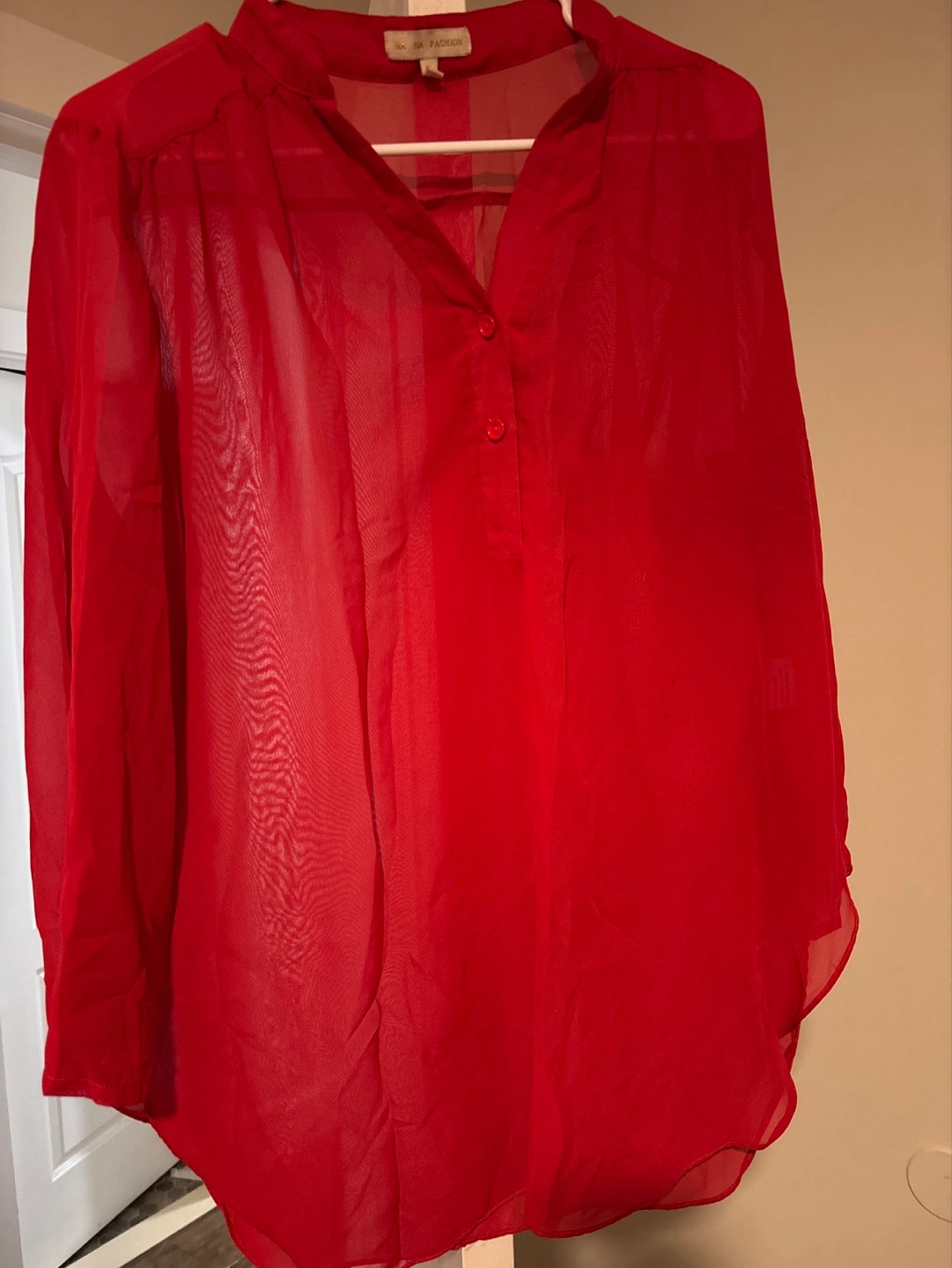 Women's red sheer blouse. Three-quarter sleeves. Button-up front. Lightweight material.