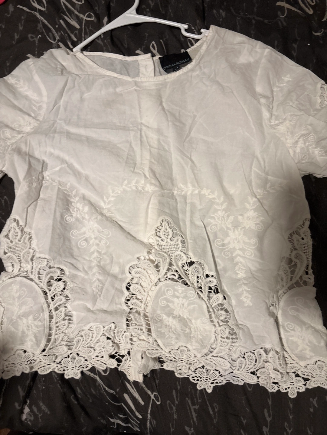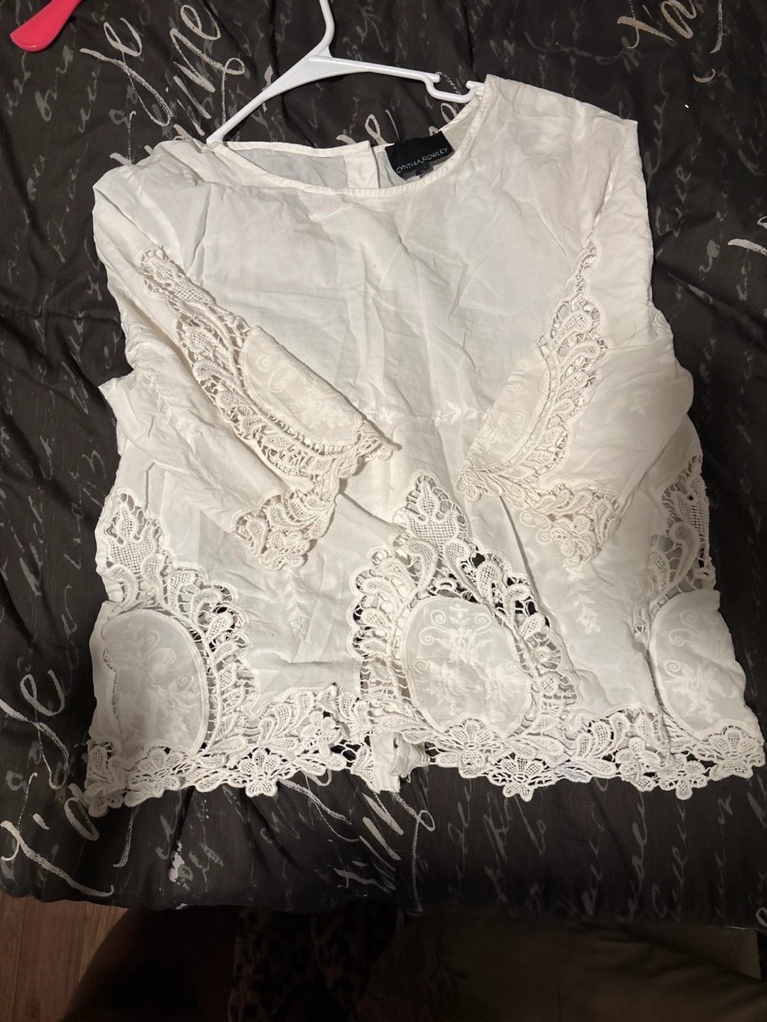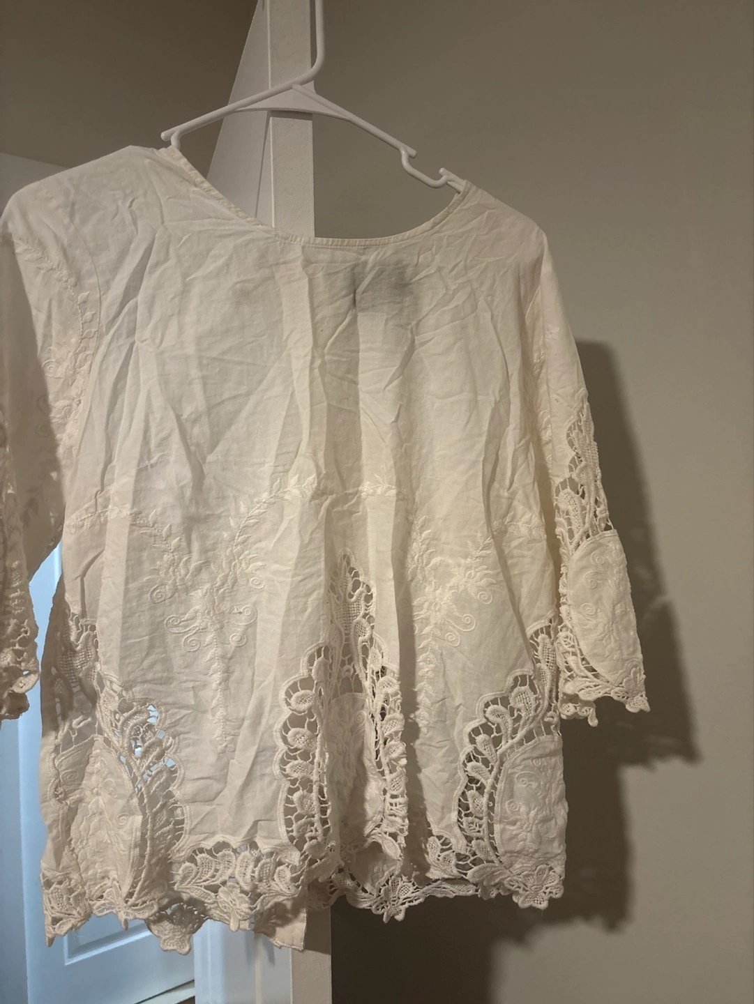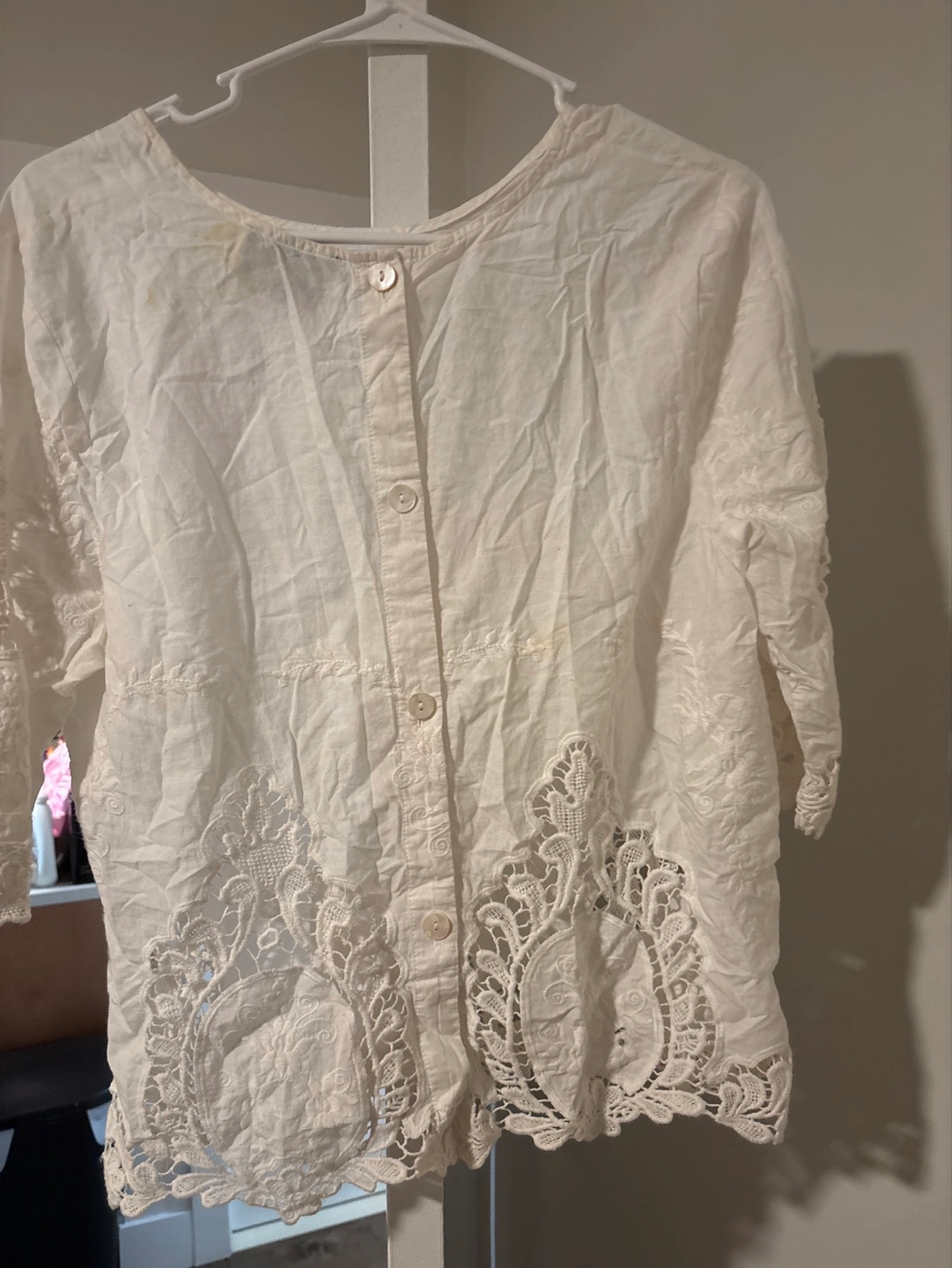 Off-white embroidered blouse. Three quarter sleeves. Lace detailing along the bottom hem. Button closure down the back.