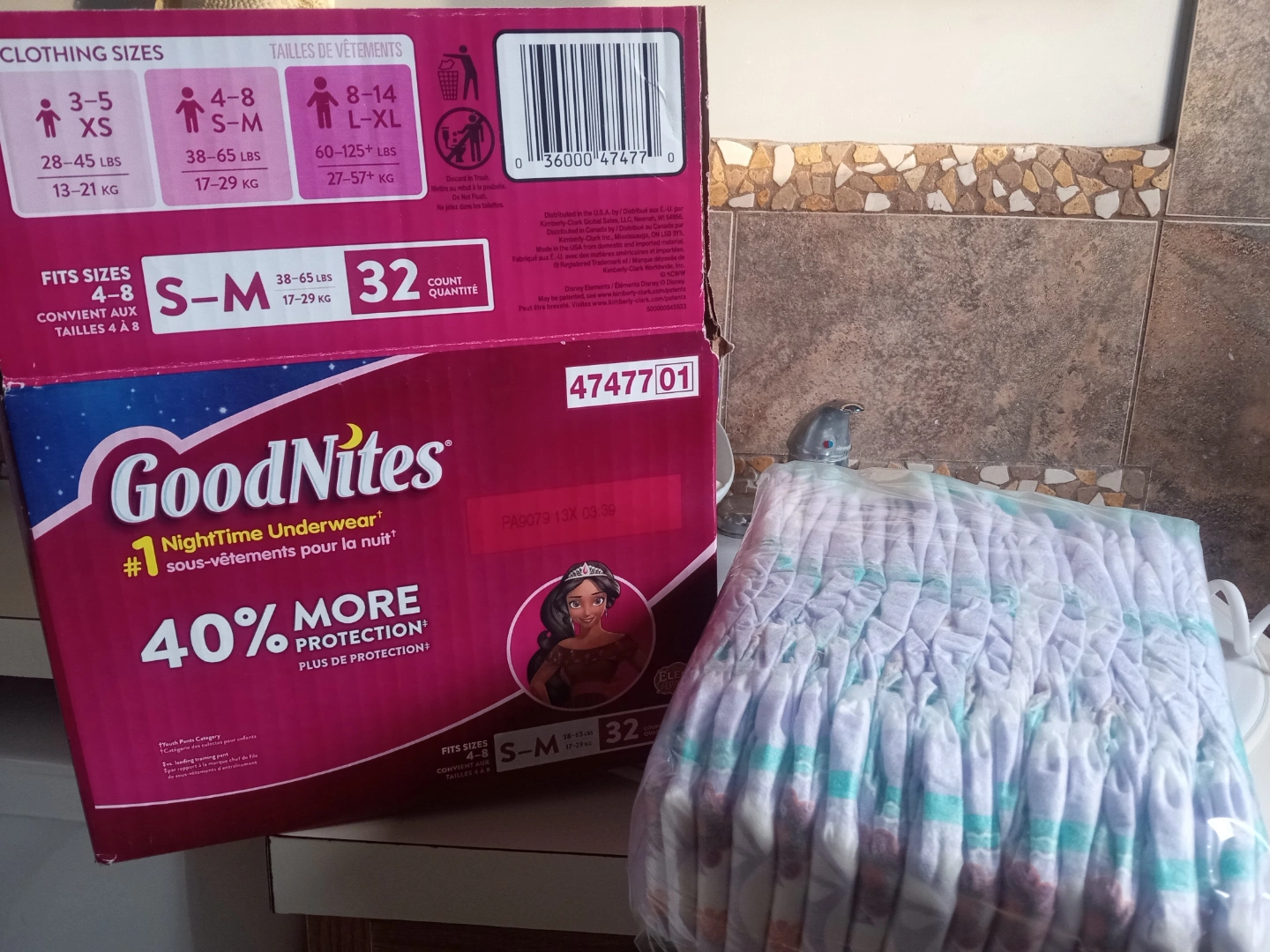 16 count unopened package of GoodNites size S-M nighttime underwear. Princess Elena Avalon design. Fits sizes 4-8. Retails approx $15.