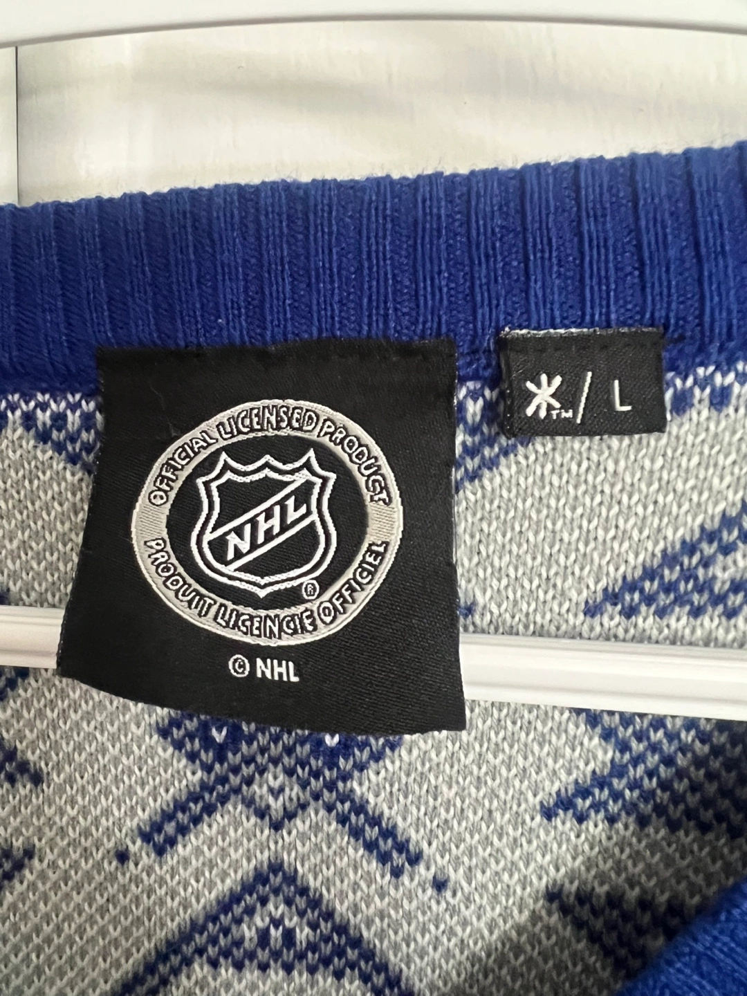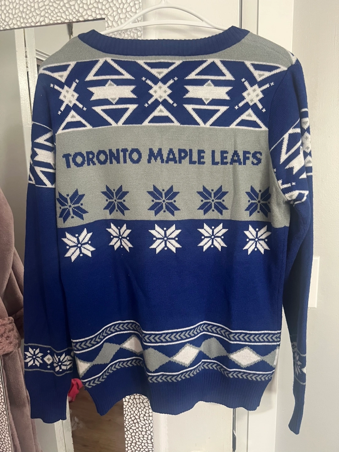 Officially licensed NHL Toronto Maple Leafs Christmas sweater. Features a blue, grey, and white snowflake pattern. V-neck. Size extra-large.