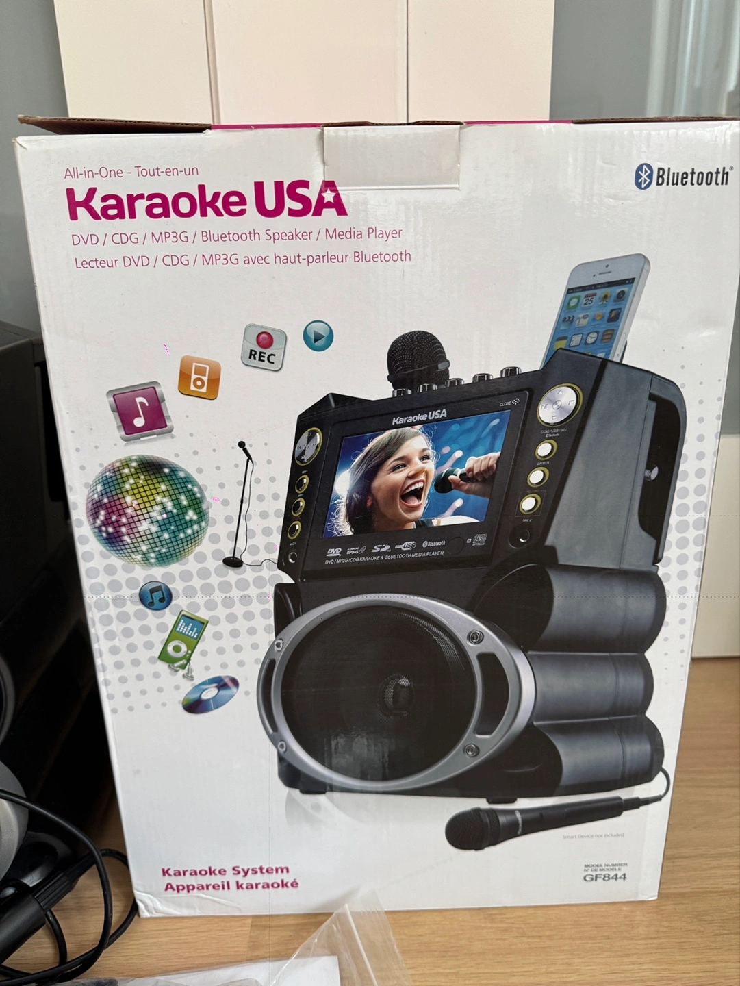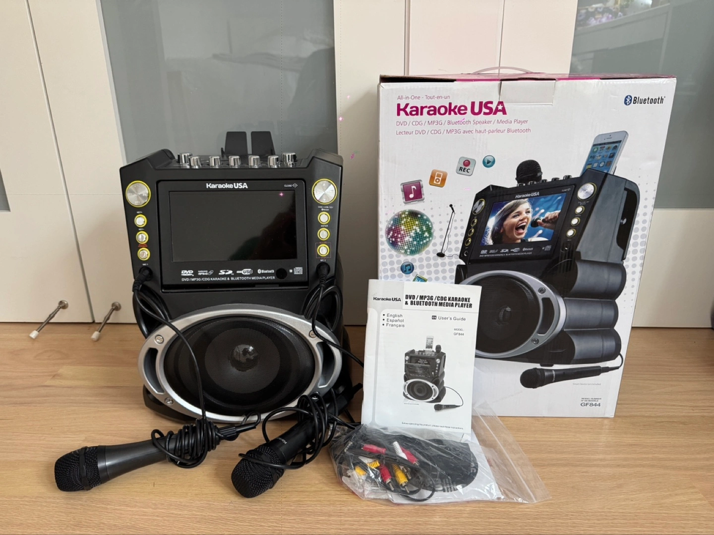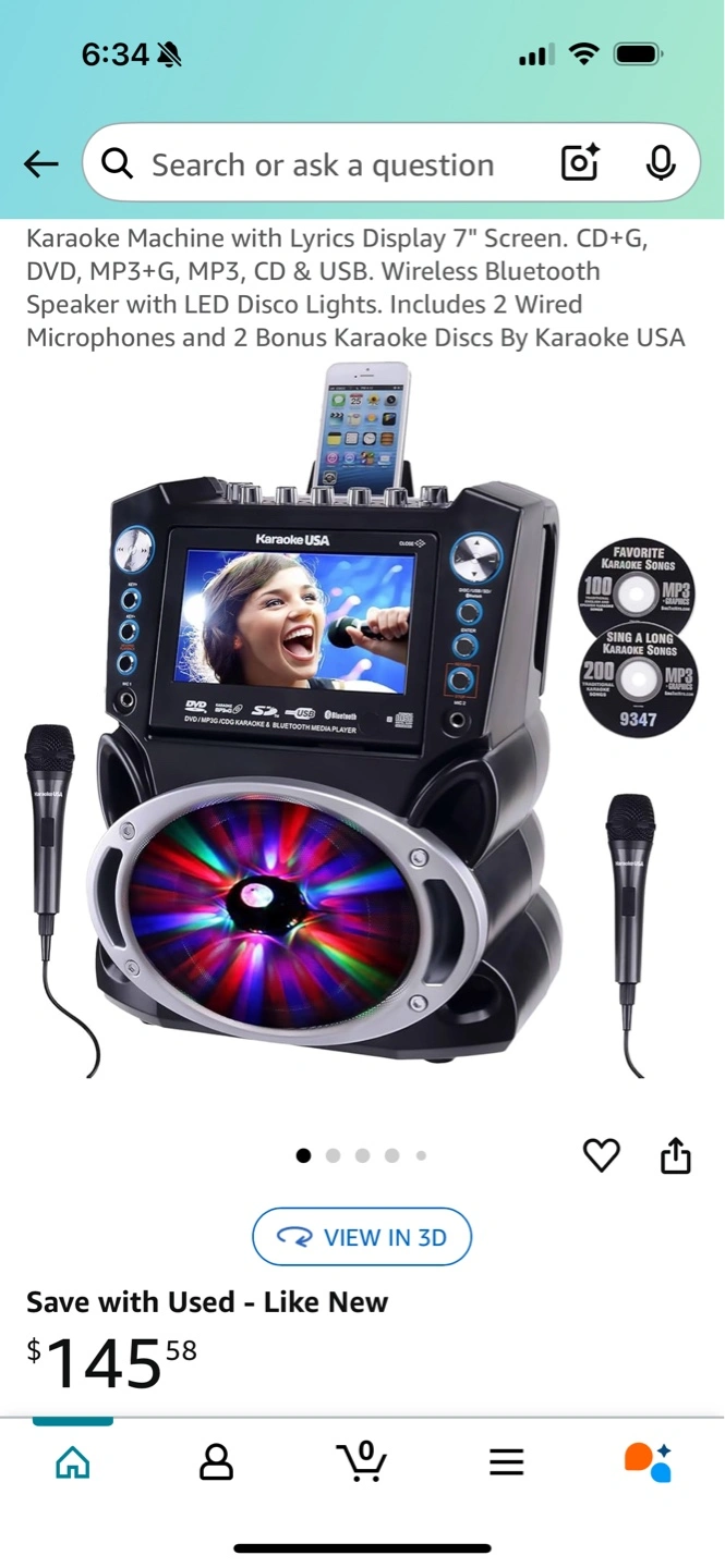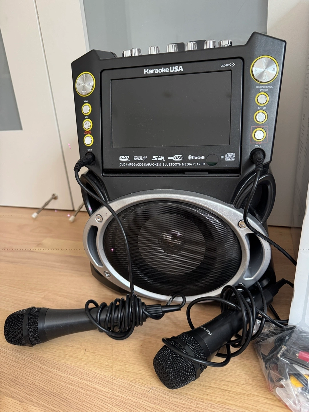 7" screen karaoke machine. Plays DVDs, CDs, MP3s. Bluetooth and USB capabilities. Includes 2 wired microphones and 2 karaoke discs. LED disco lights. Like new condition.