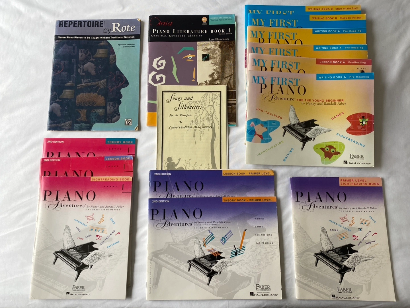Collection of piano method books. Includes theory, lesson, sightreading, and writing books. Various levels and titles. Good for beginners to intermediate students. Faber and Hal Leonard publications.