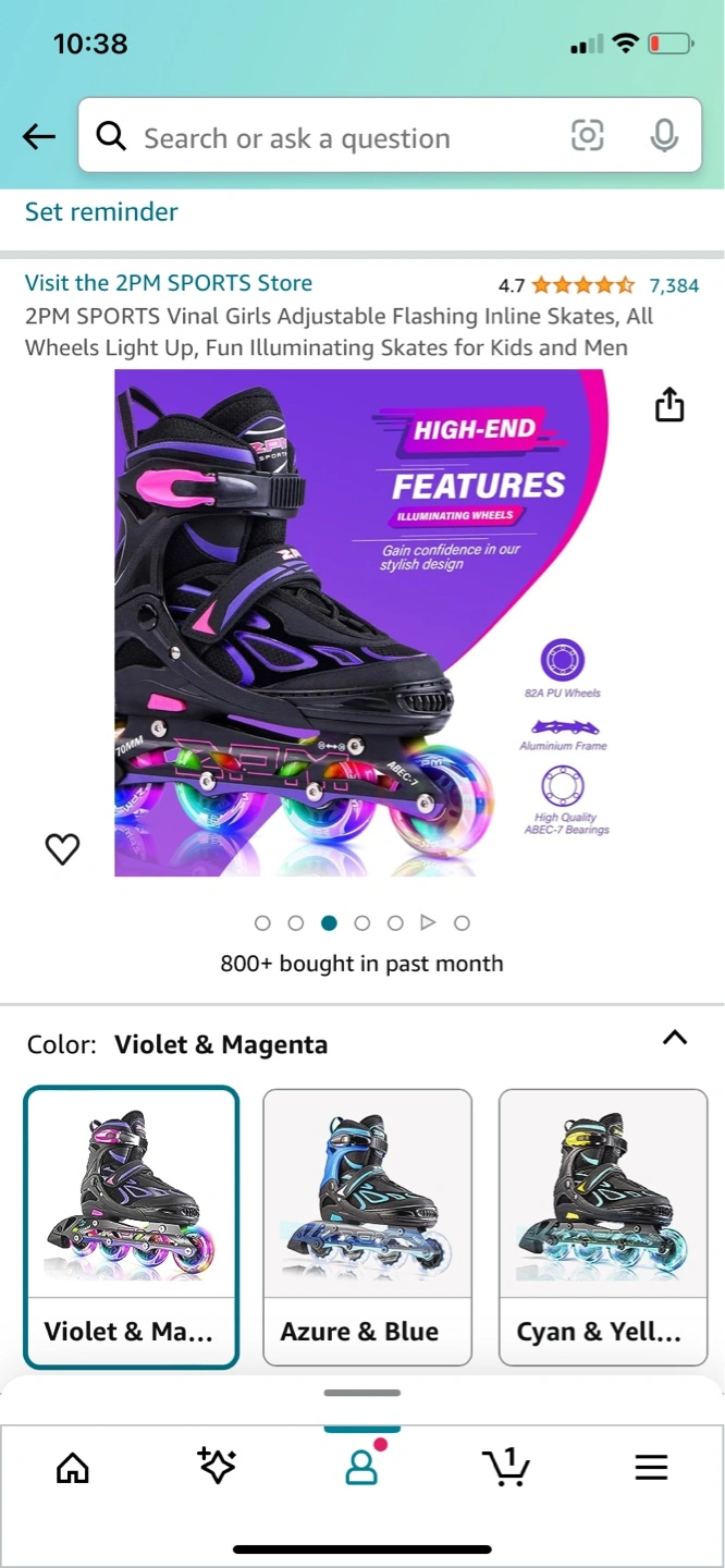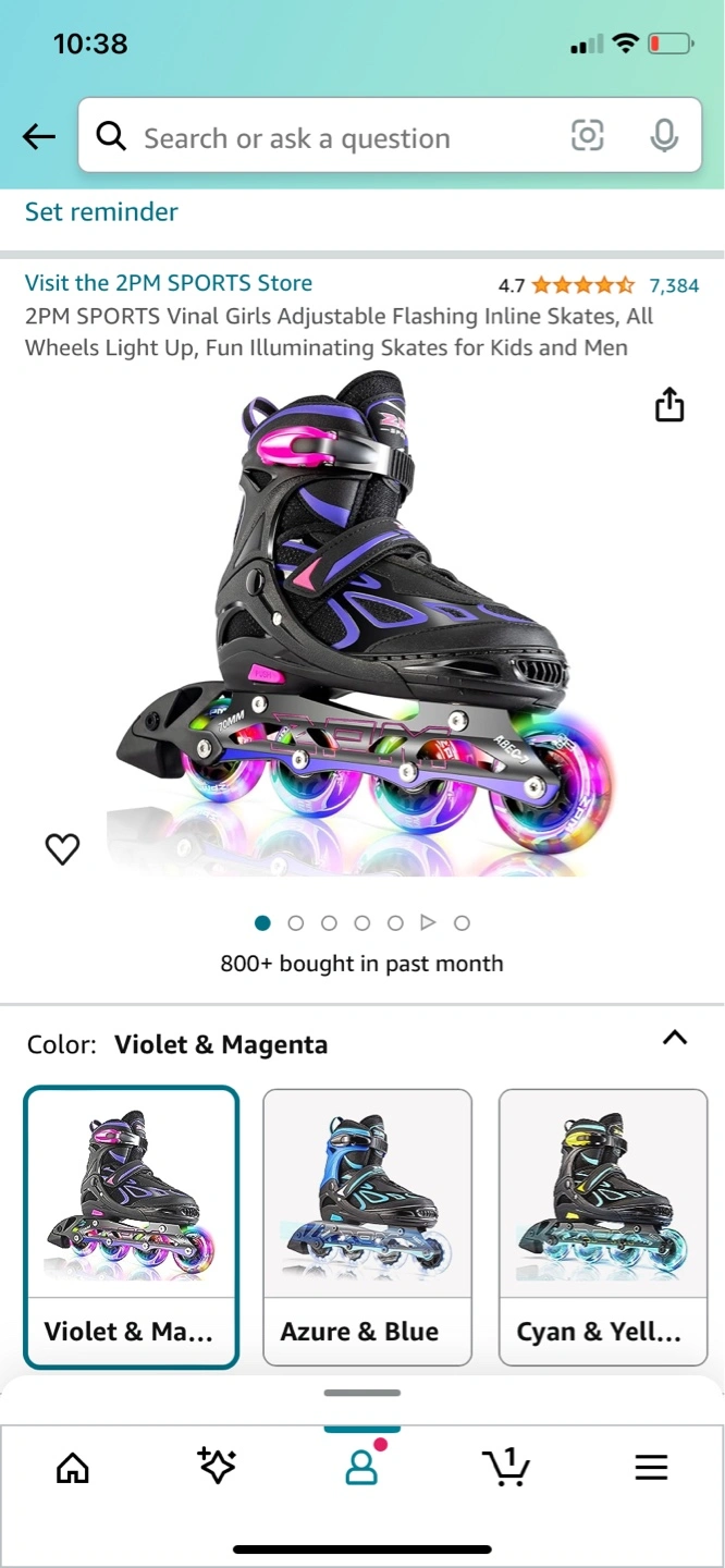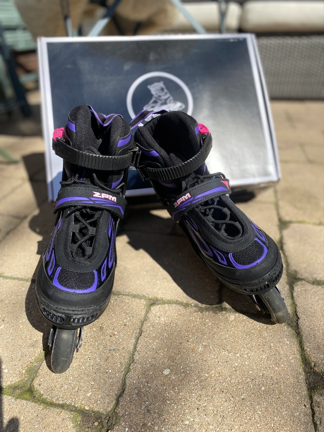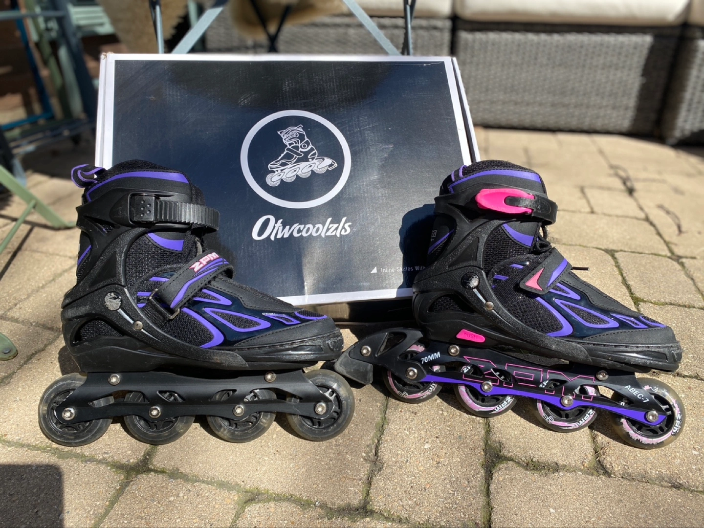 Girls adjustable inline skates. Light up wheels. Violet and magenta color. Aluminum frame. High-quality ABEC-7 bearings. Size adjustable from 1 to 4.