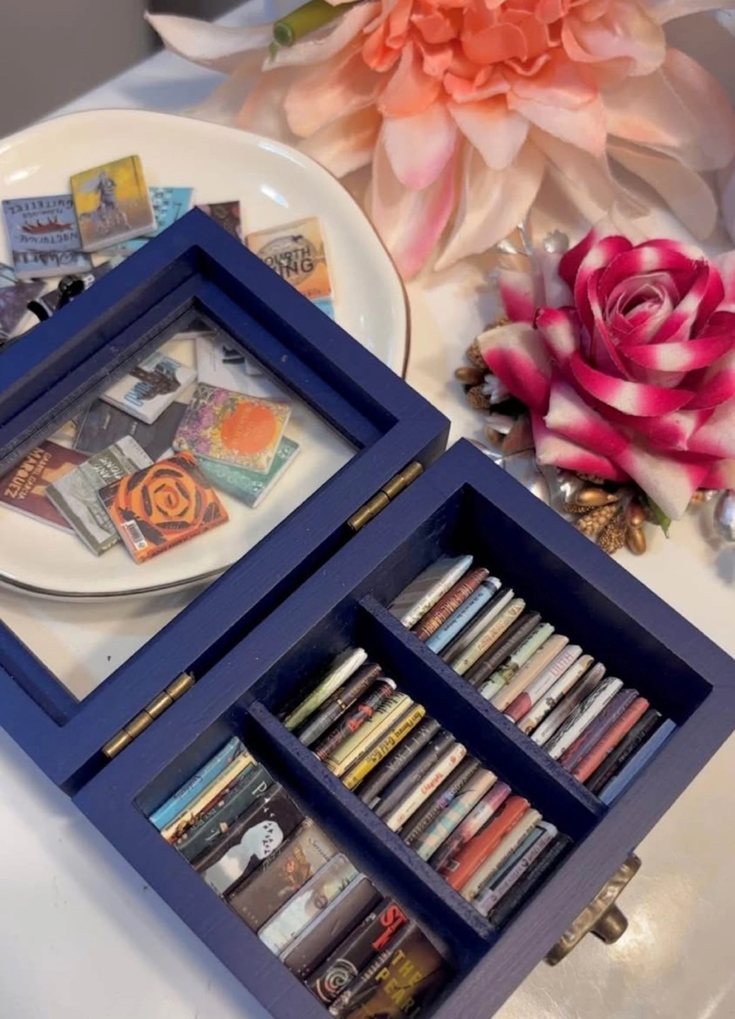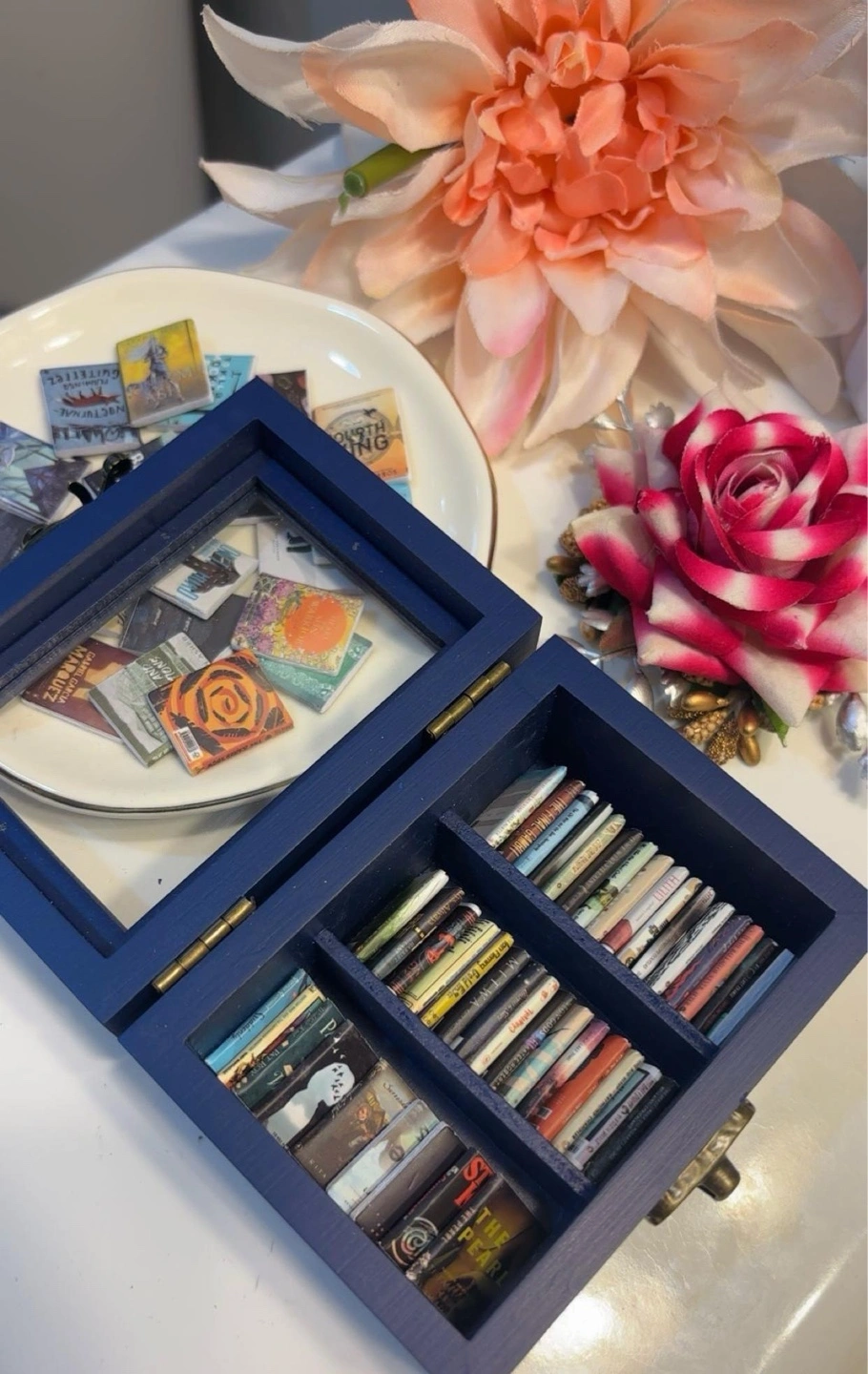 Adorable navy blue wooden box. Holds miniature books. Glass top. Perfect for a book lover's desk or shelf.