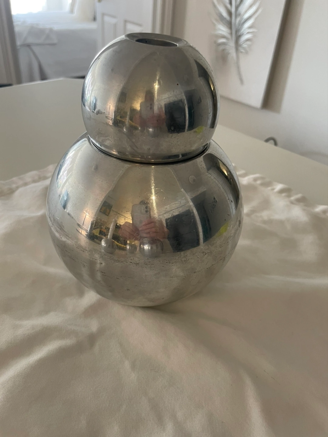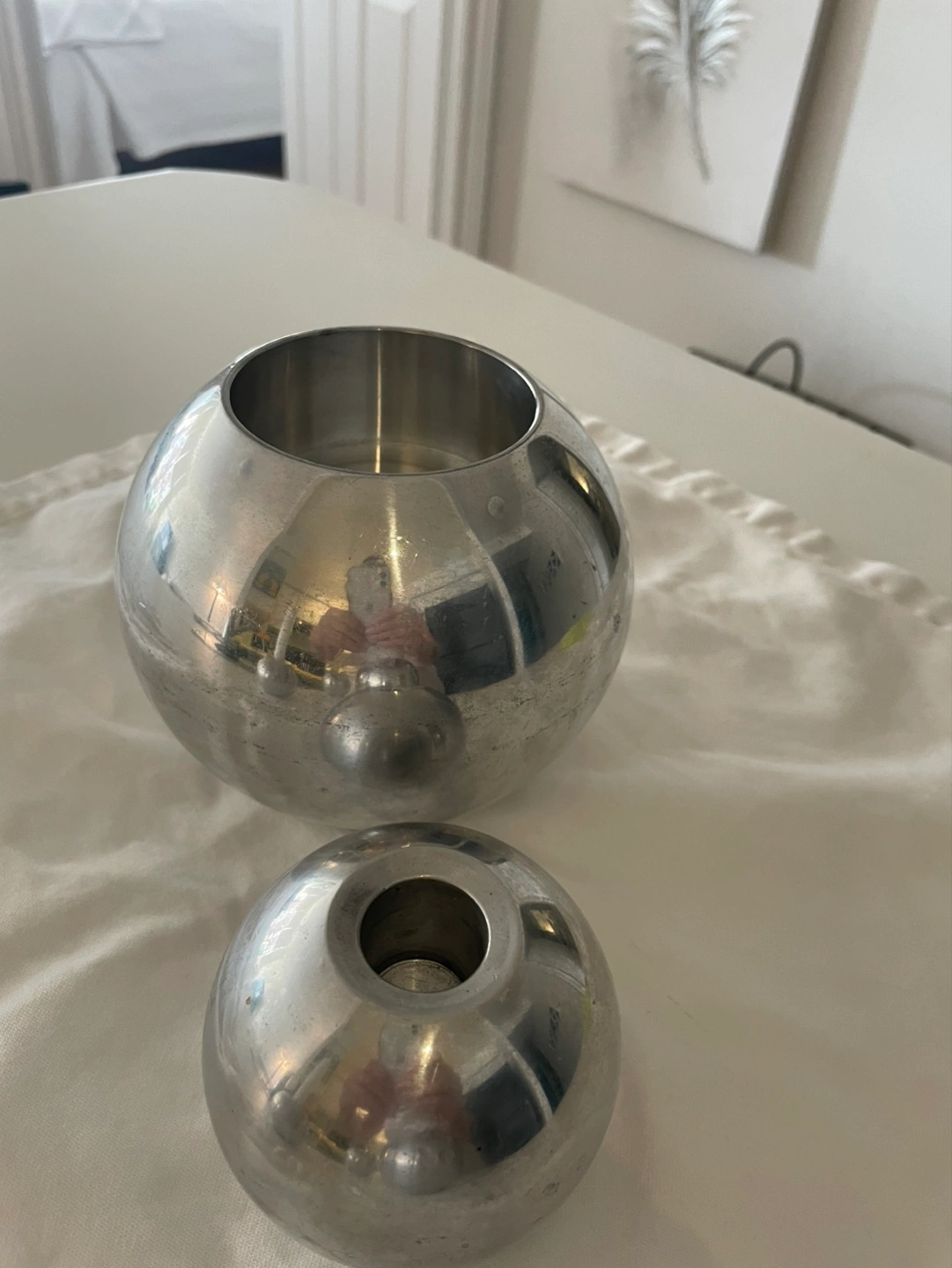 Vintage, modernist IKEA aluminum spherical candle holders. (2) Stackable. Large sphere is 5" tall and small is 3" tall. Rare find. Shiny with minimal scuffing. Pick up in Mount Pleasant/Davisville area or Yonge/Eglinton.
