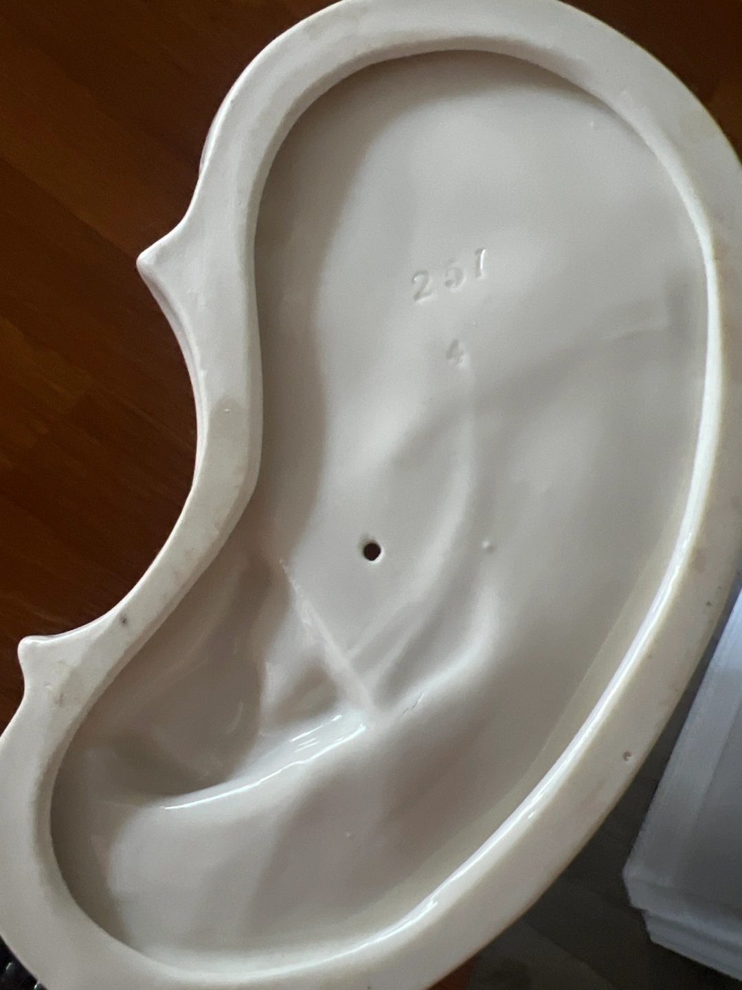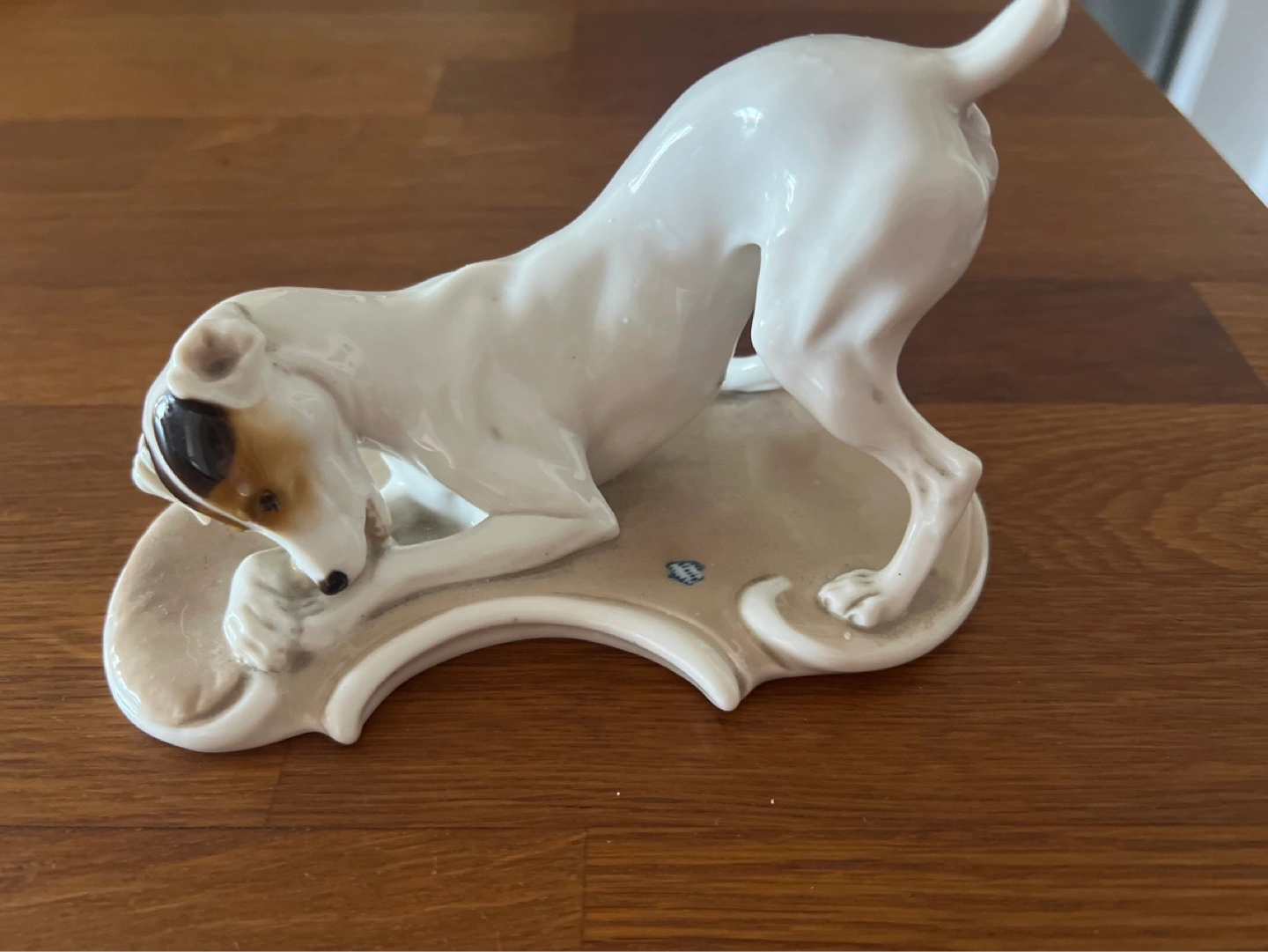 Antique porcelain figurine of a dog. White with brown markings. Unique design. Collectible item. Excellent condition.