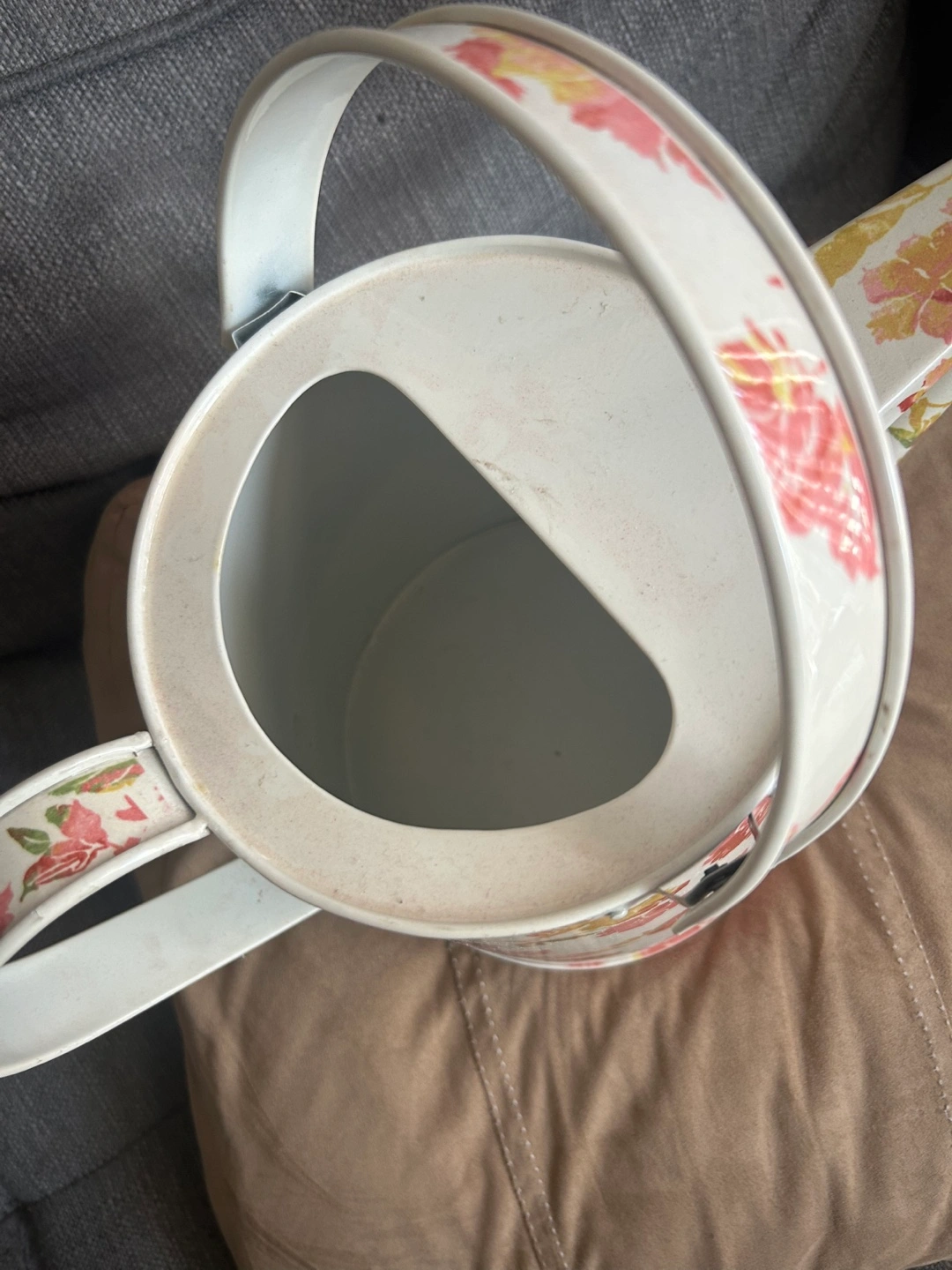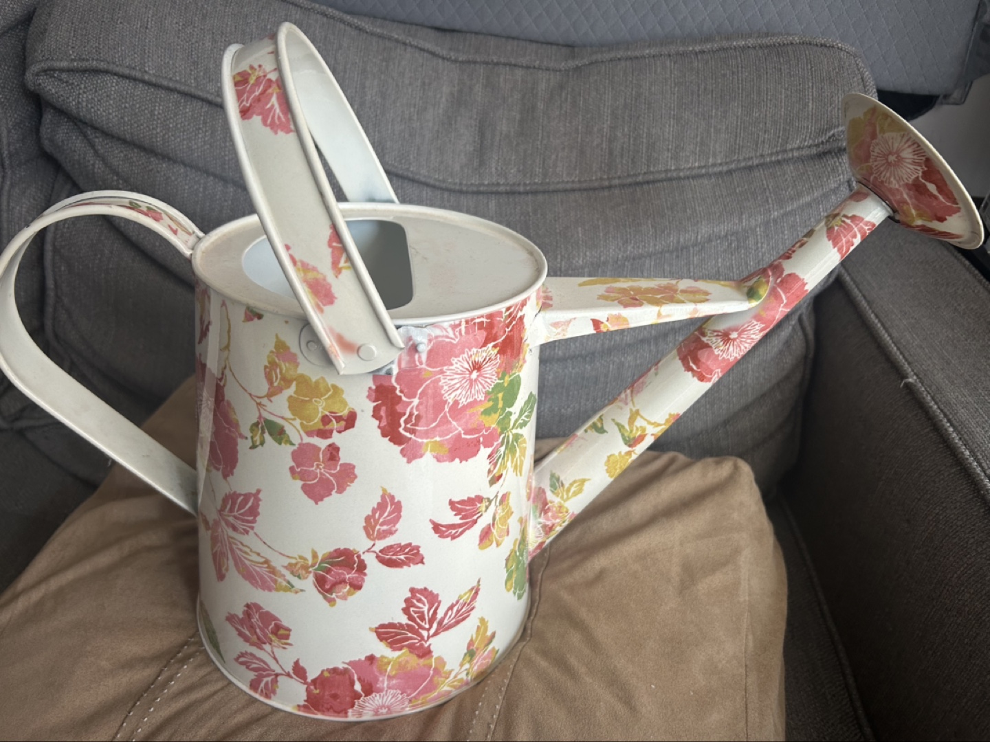 Metal watering can. Floral print. White background with pink and yellow flowers. Unused condition. Great for gardening or home decor.
