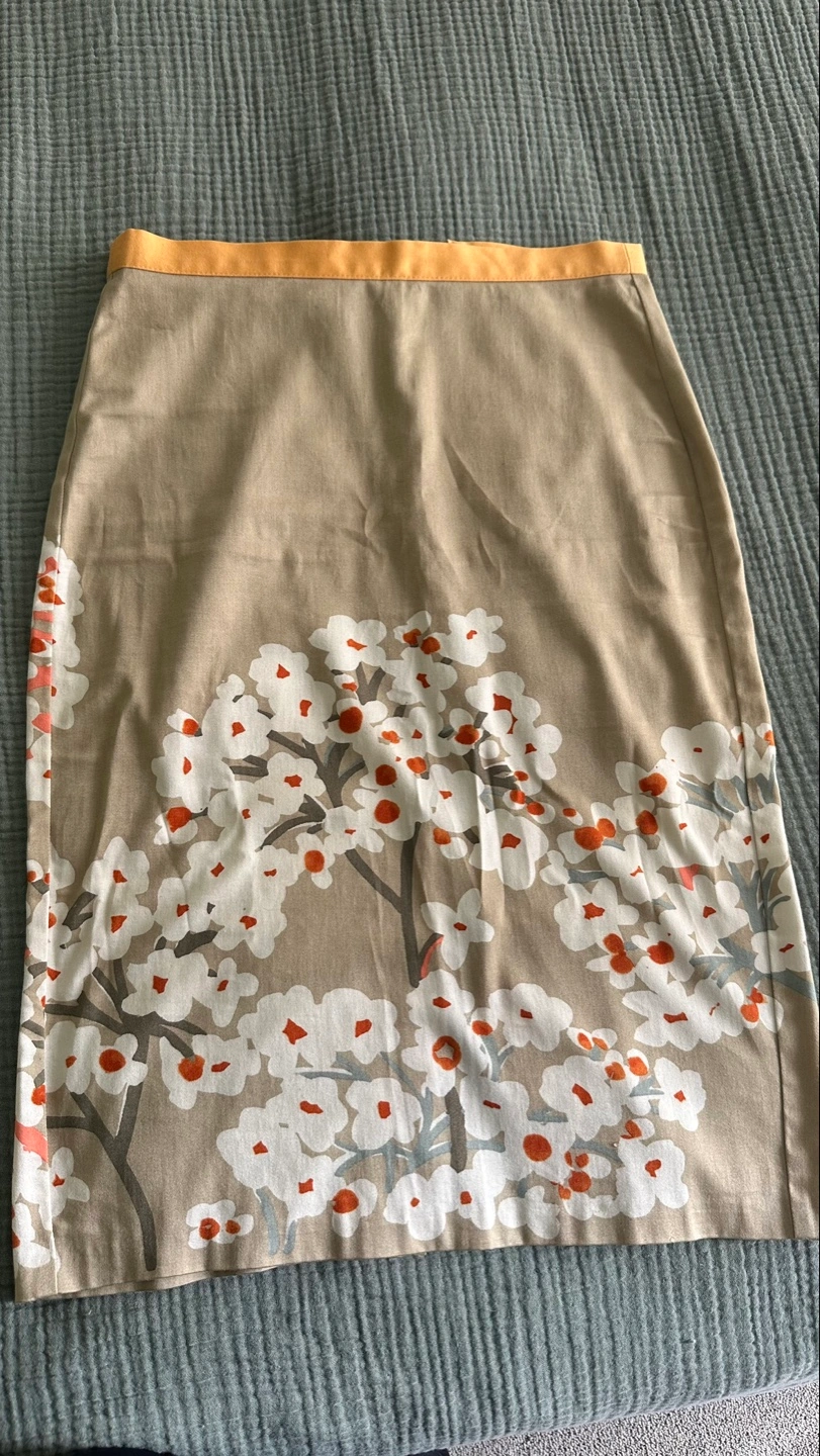 Beige pencil skirt, size 38. Features a mustard yellow waistband and a floral print. Fabric appears to be cotton or cotton blend. Good condition.