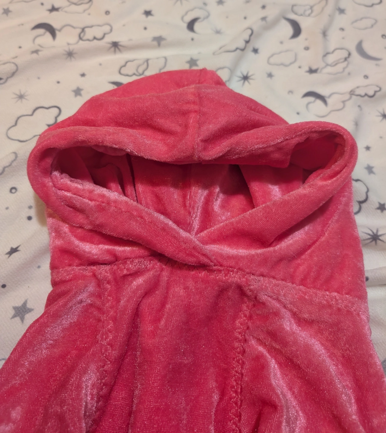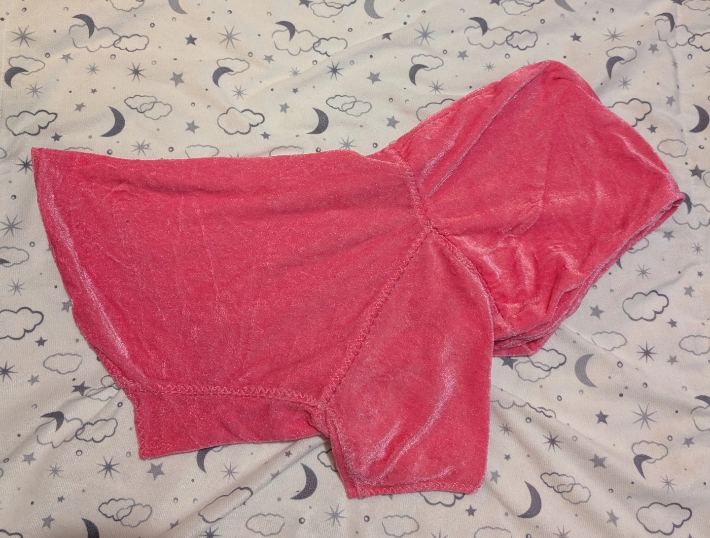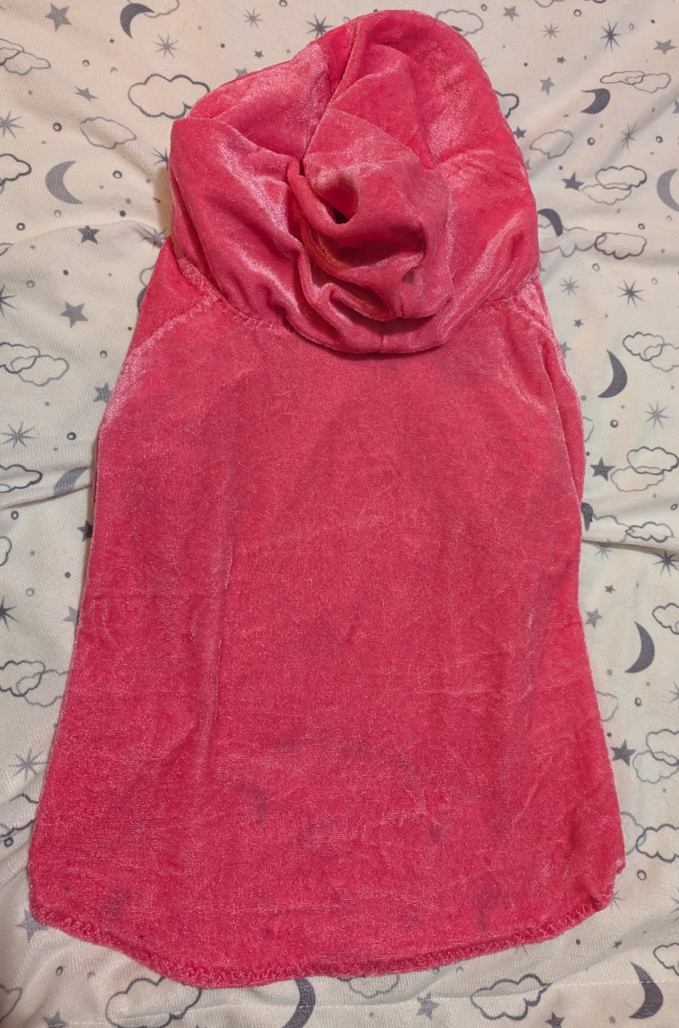 Adorable pink velour dog hoodie. Handmade. Soft water resistant material, kept my young dog's back dry from the rain when it fit her. Perfect for keeping your furry friend warm and stylish. Medium size (good for 15-20in or 38-51cm chest).
