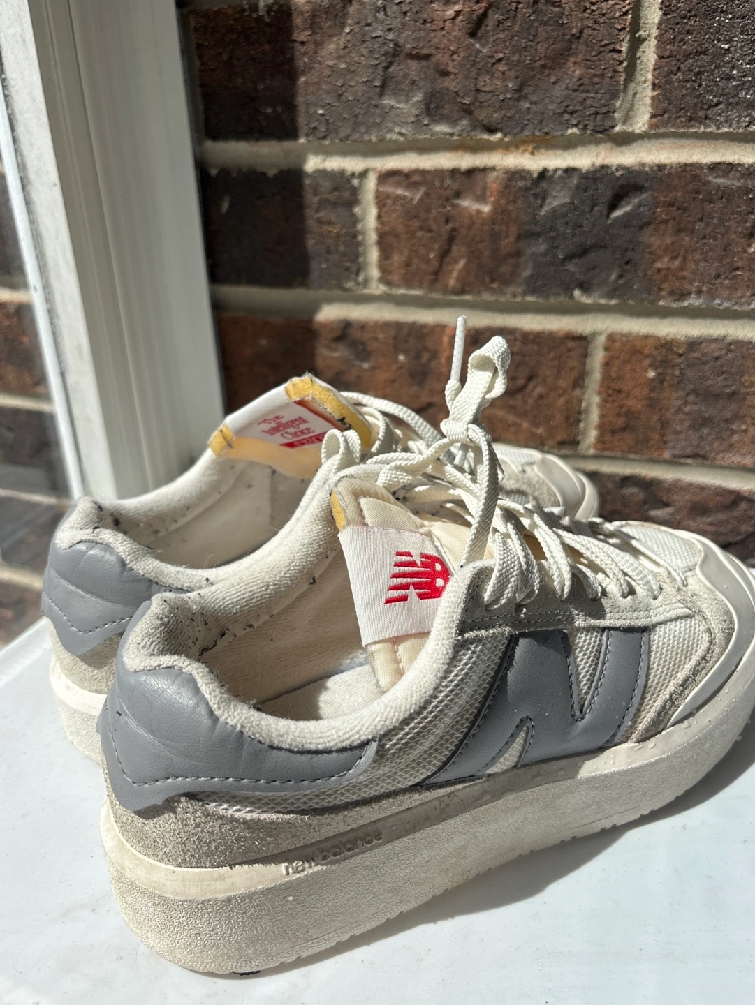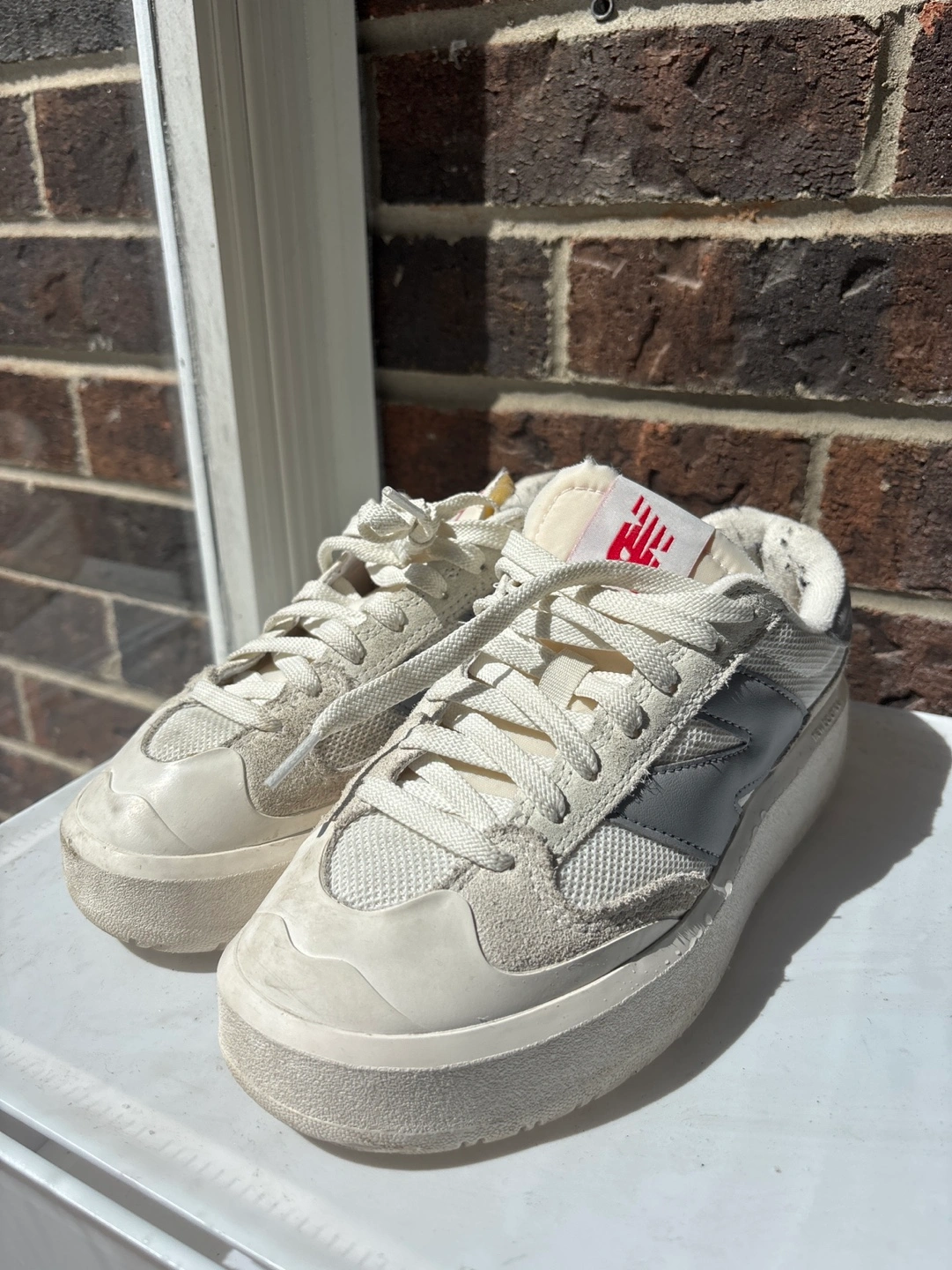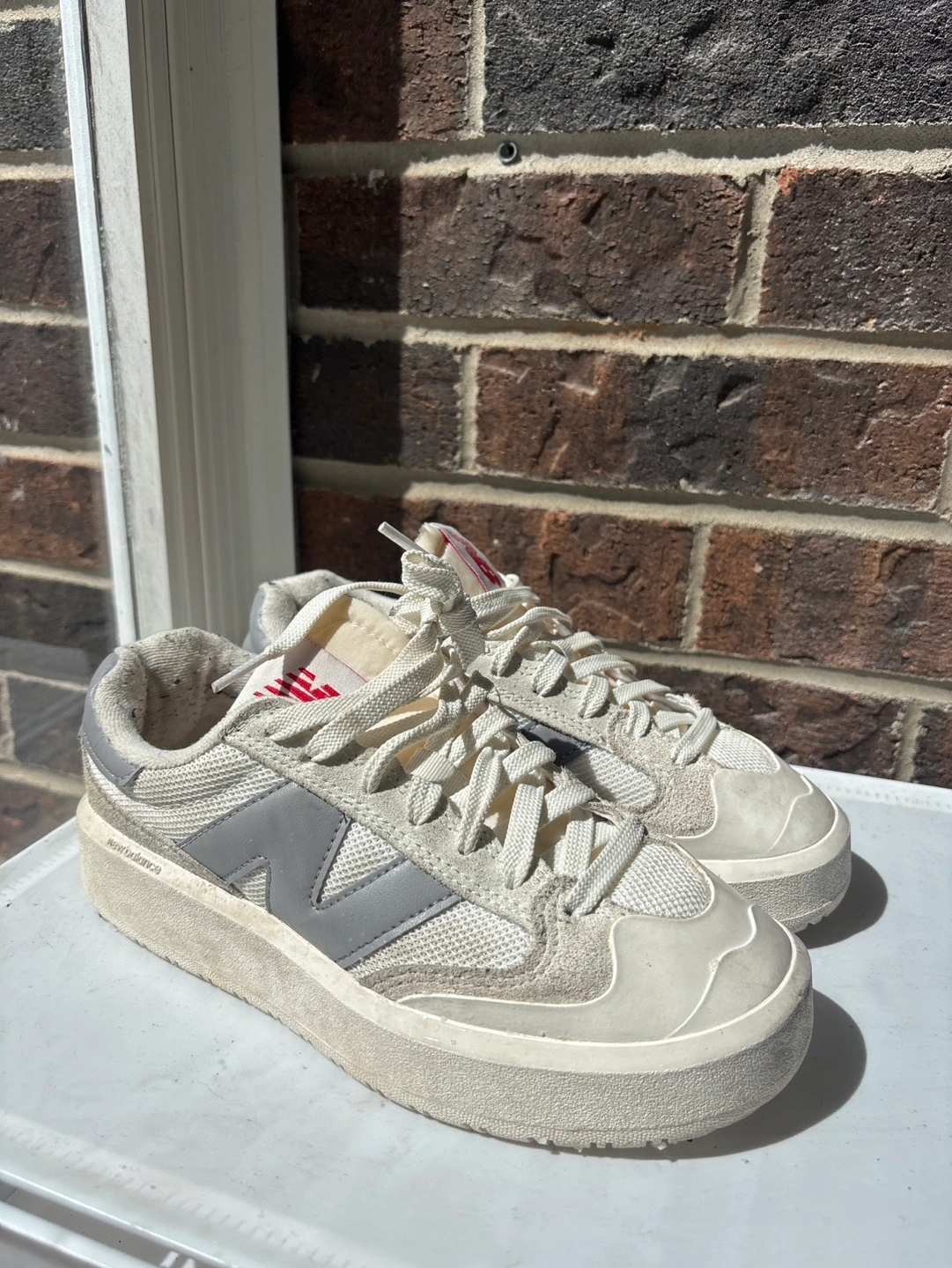 Women's New Balance sneakers. Off-white and grey colourway. Platform style. Minimal wear but there are some black fluffs (from my knitted pants) that need to be picked off