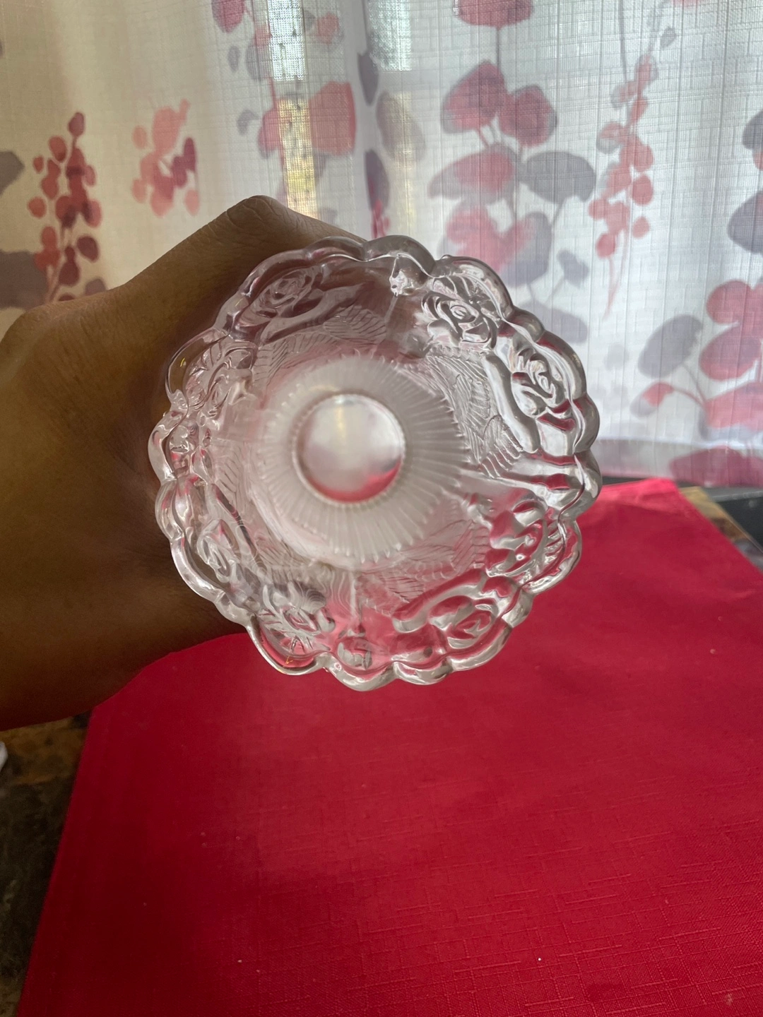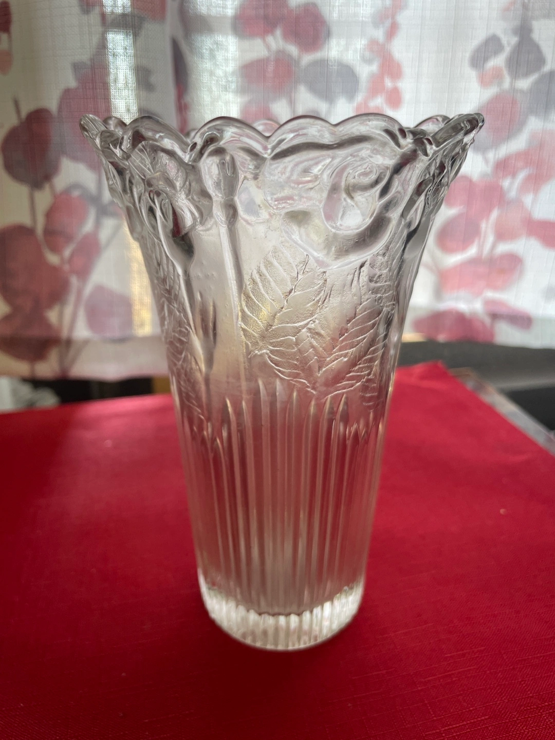 475Pretty clear glass vase. Rose design. Ribbed detailing. Perfect for a small bouquet or home decor.