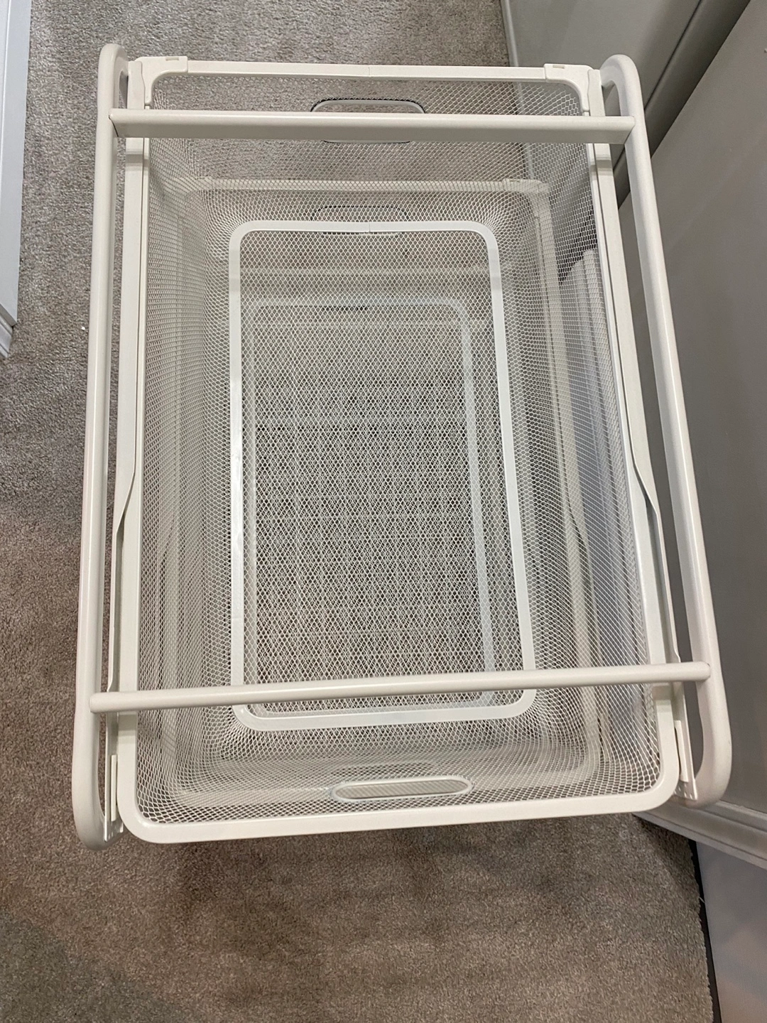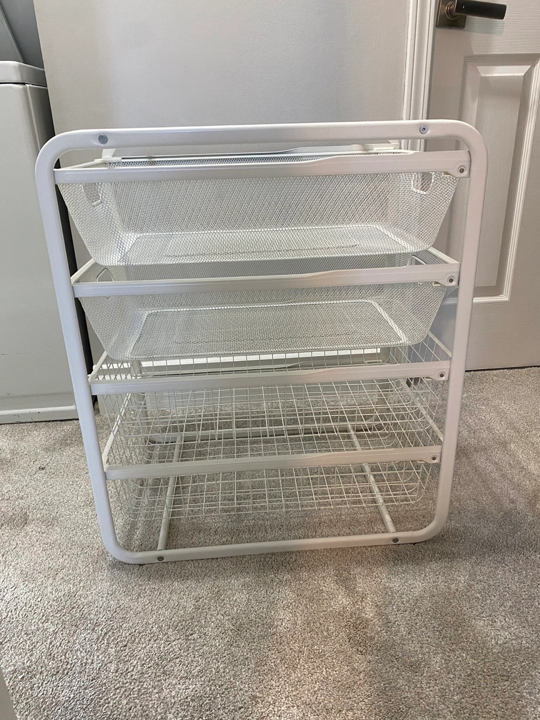 4-tier wire basket storage organizer. White metal frame. Great for organizing closets, pantries, or bathrooms. Pull-out drawers.