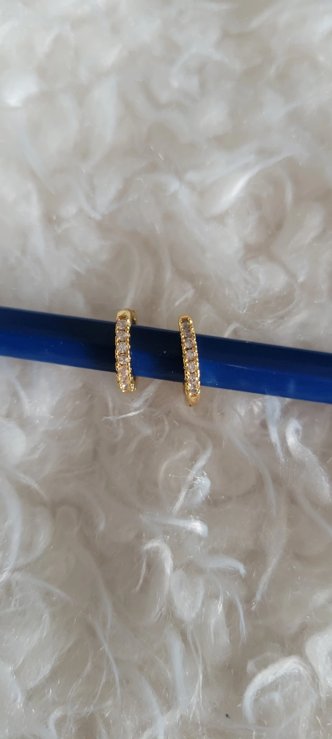 Small gold-toned hoop earrings. Set with clear cubic zirconia stones. Elegant and understated design. Perfect for everyday wear.