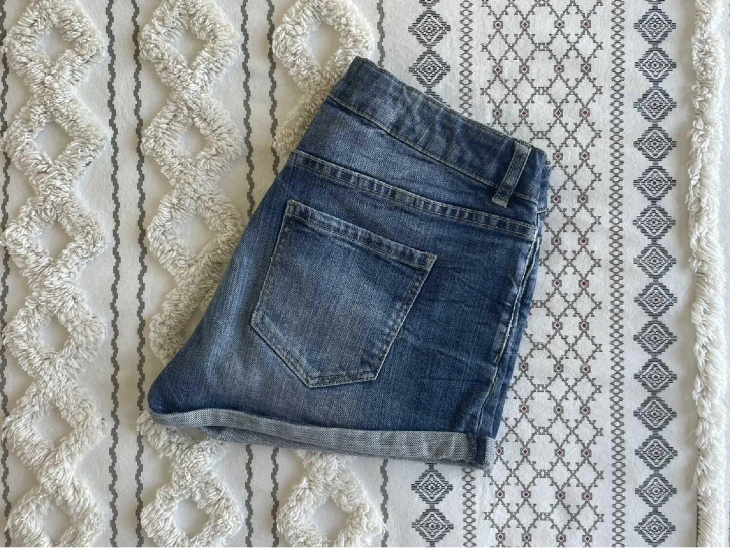 Low waist Denim shorts. Rolled cuffs. Five-pocket styling. Light wash denim. Size Small. In excellent condition.
