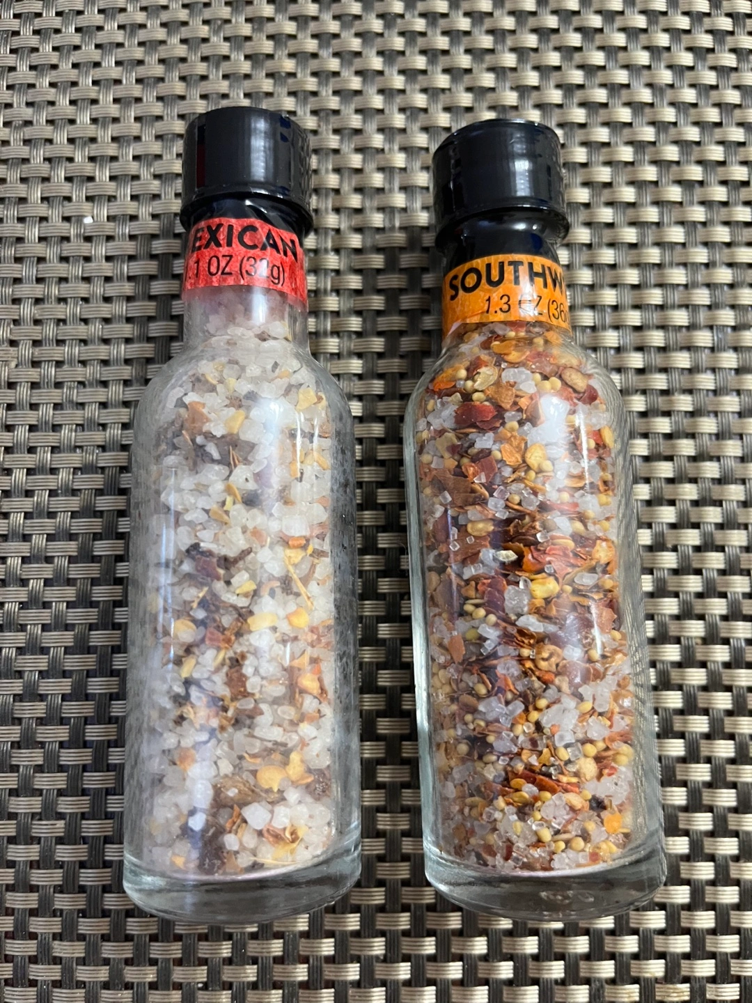 Set of two small glass spice bottles. One labelled Mexican, one labelled Southwest. Contains salt blends with various spices. local pick up only