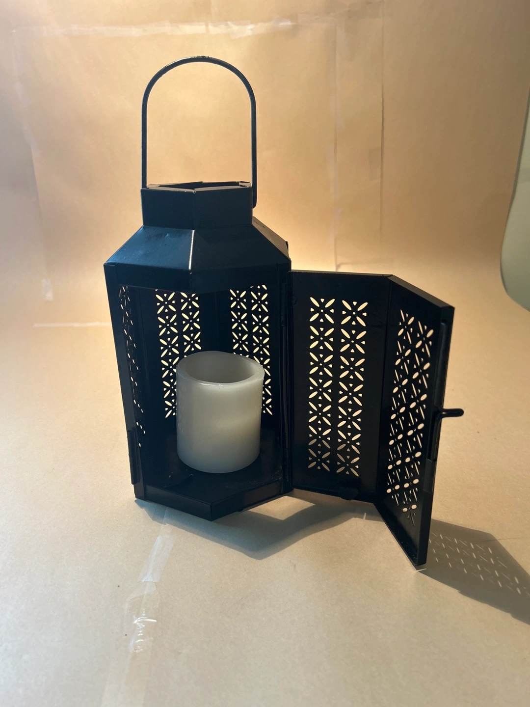 Small black metal lantern. Features a carrying handle and cut-out designs. Holds a small candle. Perfect for decor. Good for outdoor, candle not included