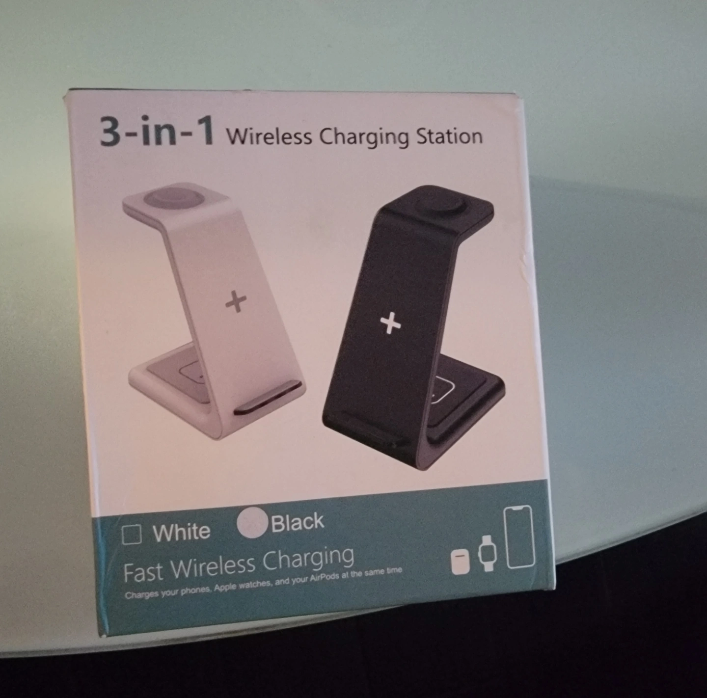 3-in-1 wireless charging station. Charges phones, Apple watches, and AirPods simultaneously. Available in black.